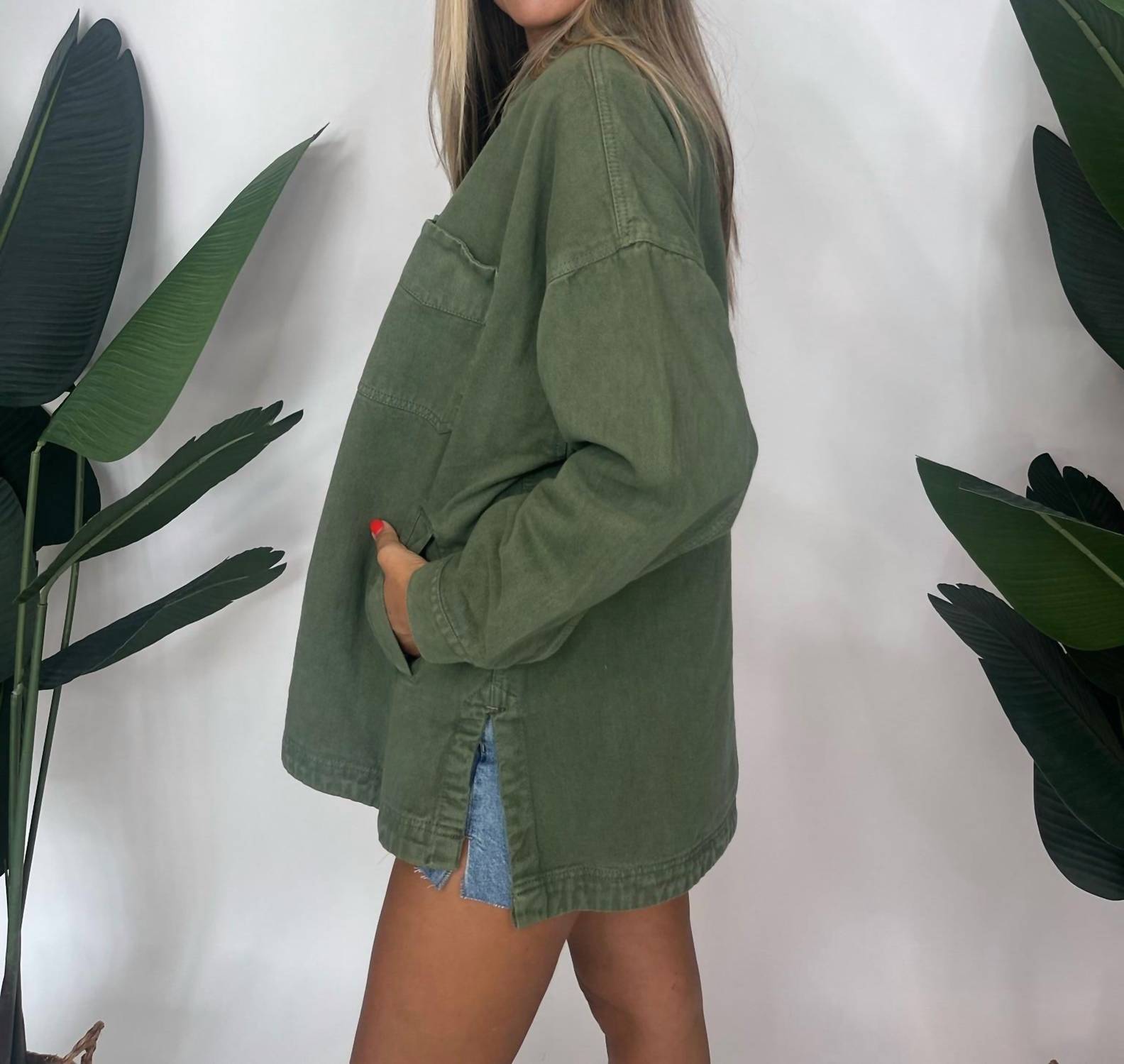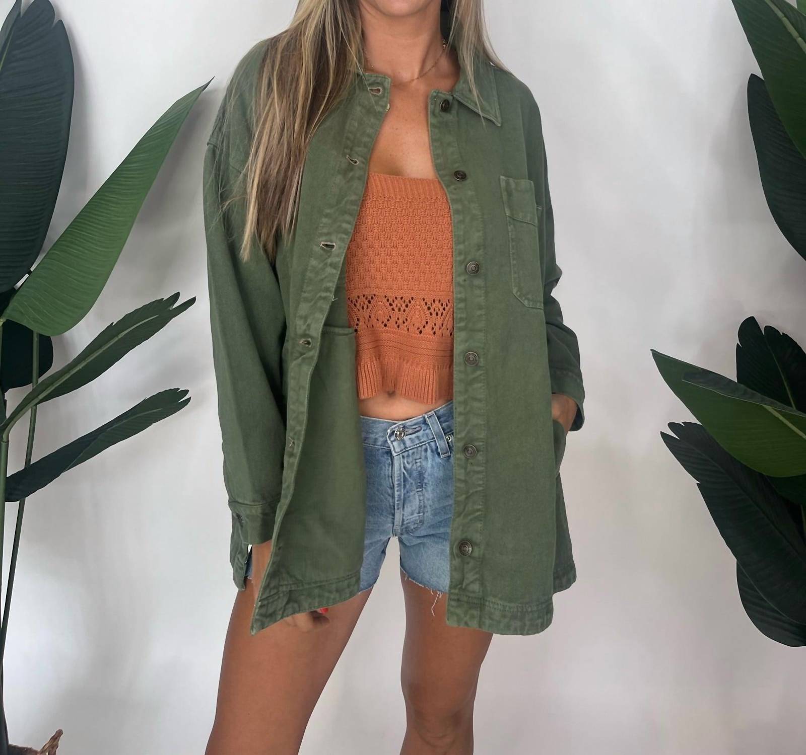Use esta jaqueta adorável sobre praticamente qualquer coisa para um visual estiloso e sem esforço. Apresentamos a Jaqueta Madison Adventurer da Free People, uma peça verde com estampa sólida para mulheres que captura perfeitamente um estilo descontraído. Esta jaqueta jeans possui mangas compridas, gola careca e bolsos grandes no peito, além de bolsos práticos para as mãos. Confeccionada em 100% algodão, oferece conforto e durabilidade com fecho de botão para facilitar o uso. O cuidado é simples, com instruções de lavagem à máquina, tornando-a a escolha ideal para versatilidade durante todo o ano. Alyssa, com 1,78 m, veste tamanho P, destacando seu corte oversized estiloso.