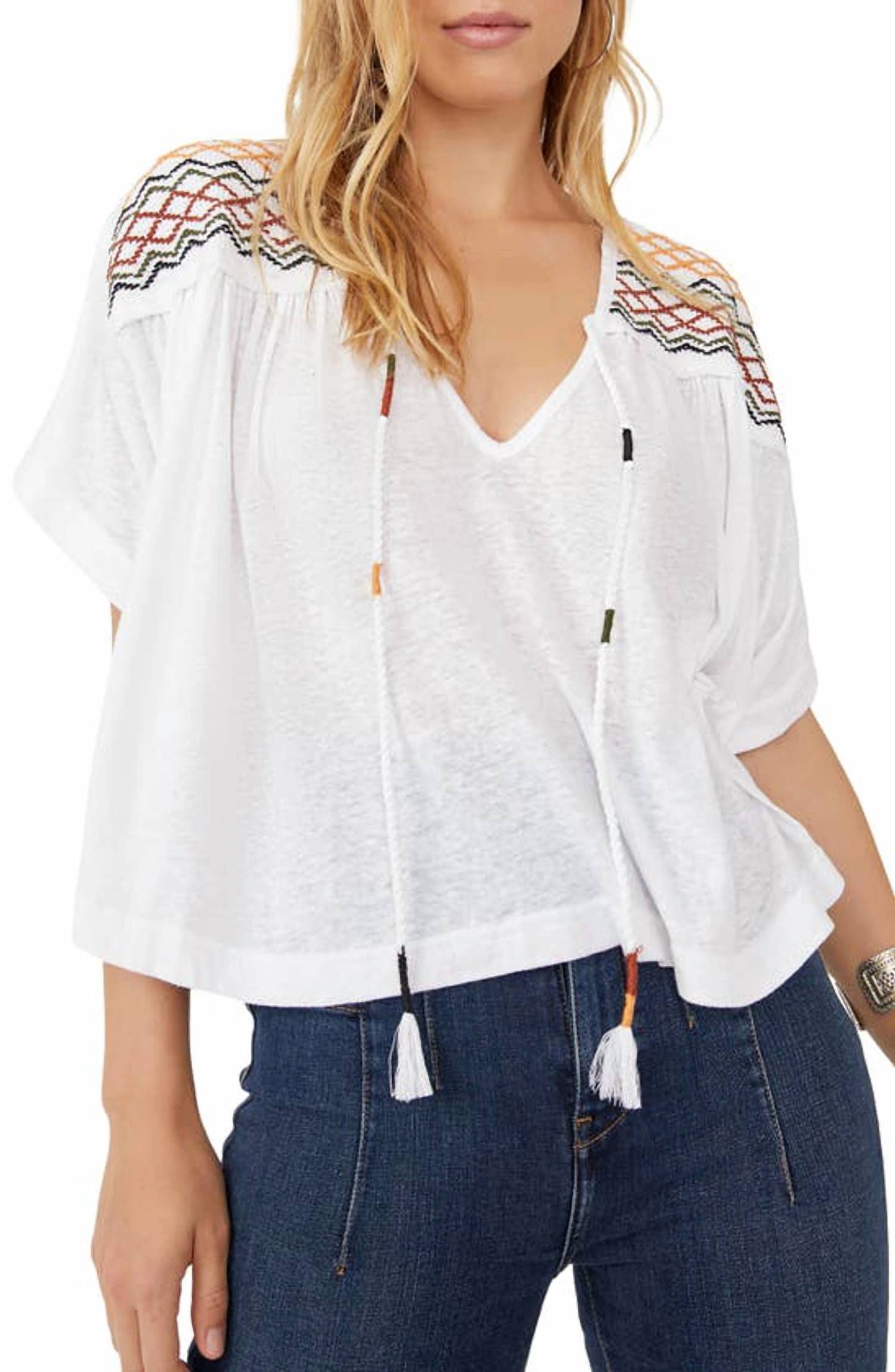 Decote em V. Detalhes estampados nos ombros. Cordões longos. Detalhe de listras estampadas nas costas. Modelagem ampla. Tecido: 58% algodão, 42% poliéster. Lavar à mão com água fria.
