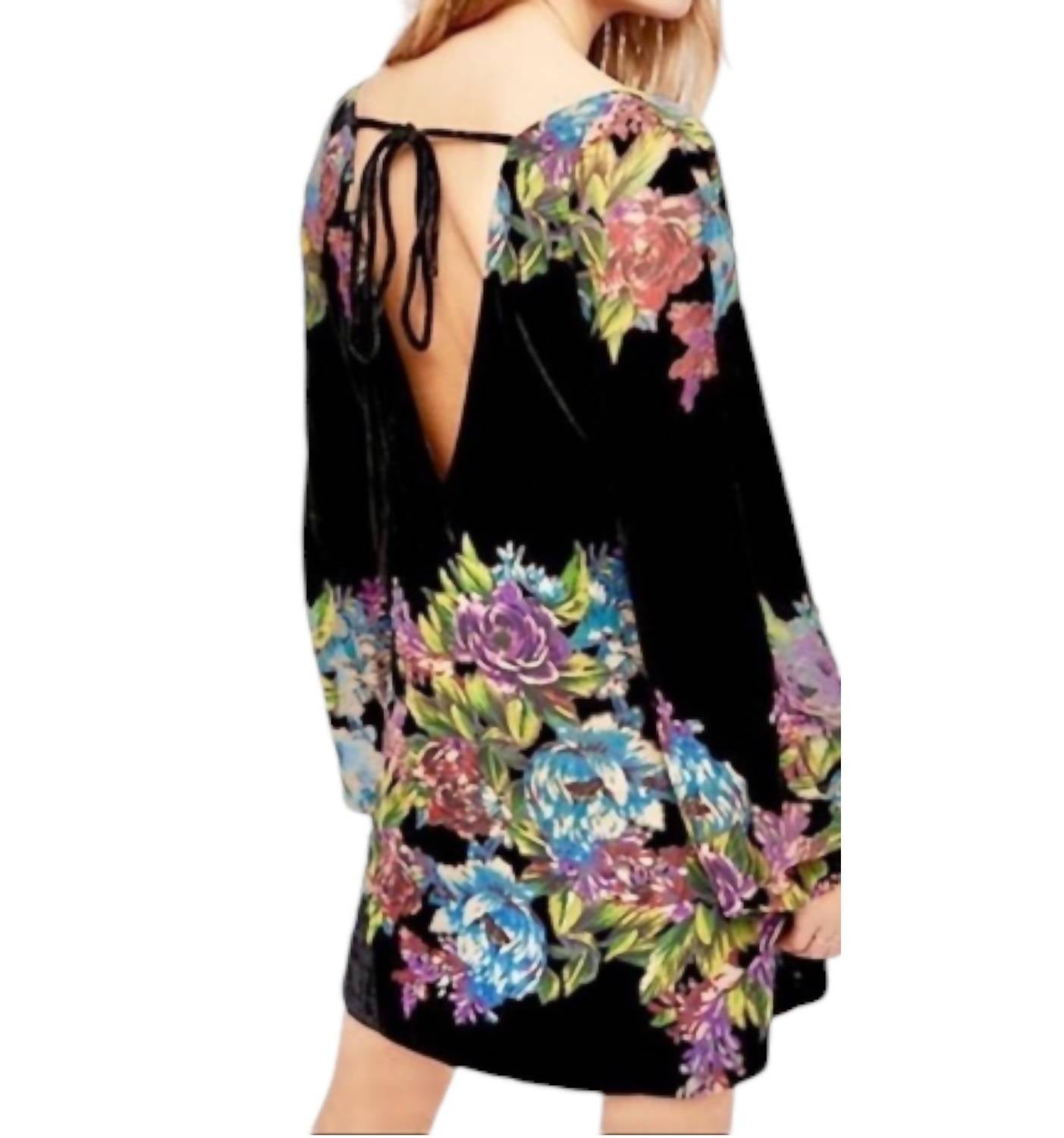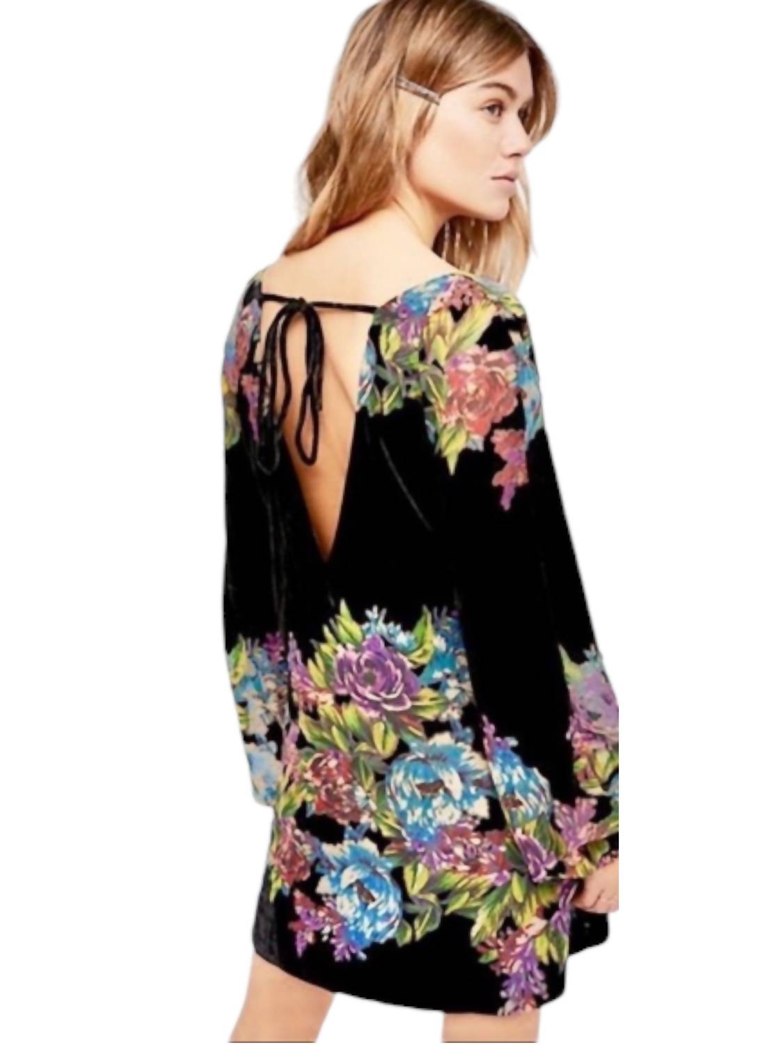 Manga comprida. Corpo forrado. Mangas com transparências. Veludo preto e estampa floral. Decote em V. Amarração nas costas. Mini. Boho. 100% poliéster.