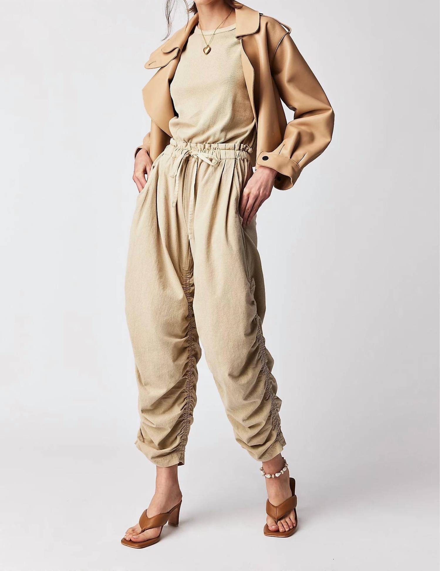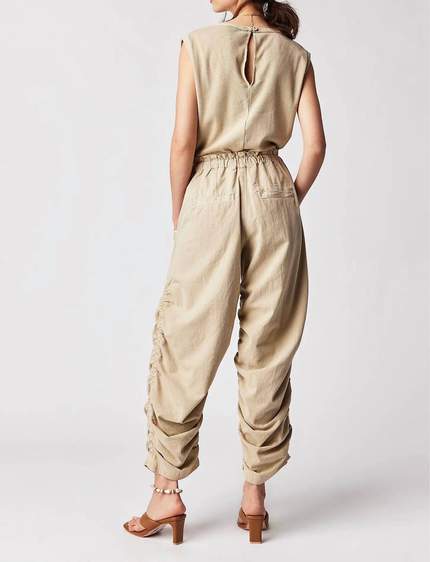 Combinação perfeita de conforto e estilo na cor Sand Jam. Com corpete inspirado em músculos e cós em tecido paper bag. Apresenta caimento relaxado e design de pernas afuniladas. Confeccionada em 100% algodão. Com fecho de botão, garante praticidade e um visual elegante. Fácil de cuidar, com lavagem à máquina. Confeccionada com detalhes cuidadosos, incluindo abertura nas costas e pernas franzidas.