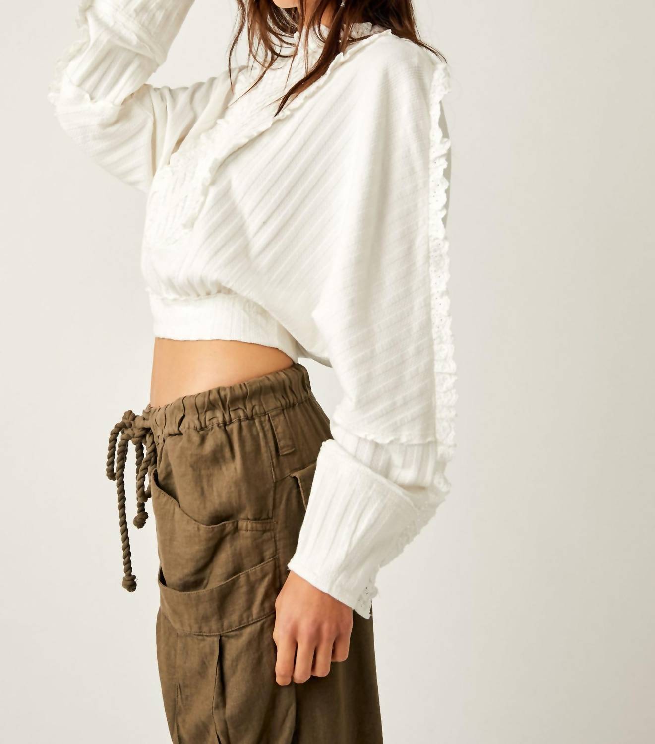 Apresentado em um tecido listrado texturizado com babador plissado e adornado com renda na frente e detalhes de babados por toda parte. Caimento relaxado e folgado. Decote redondo, bainha inferior definida, mangas largas, costura definida nos punhos das mangas. Comprimento 21,5". Mangas 31". Lavagem à máquina com água fria. 97% algodão, 3% elastano.