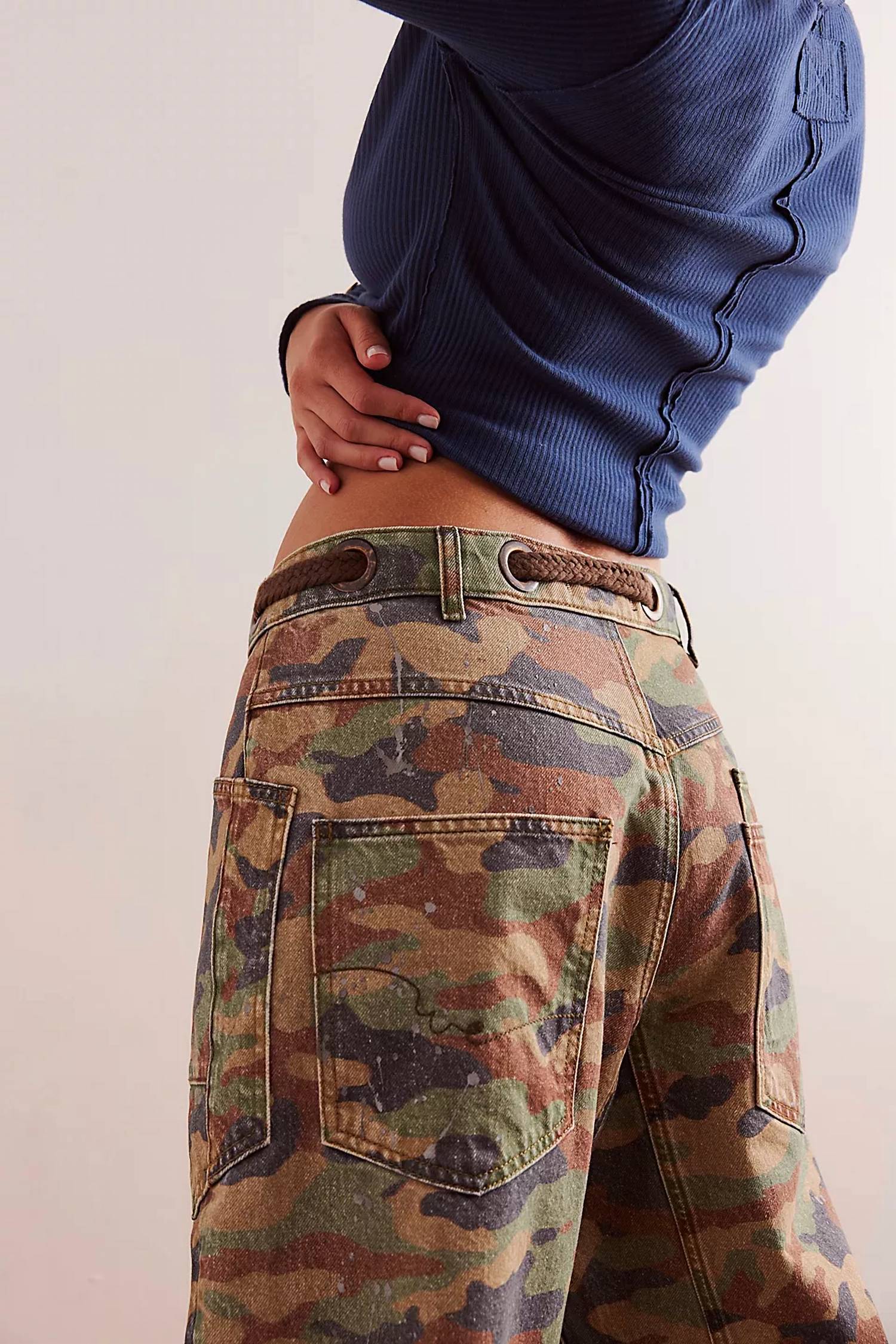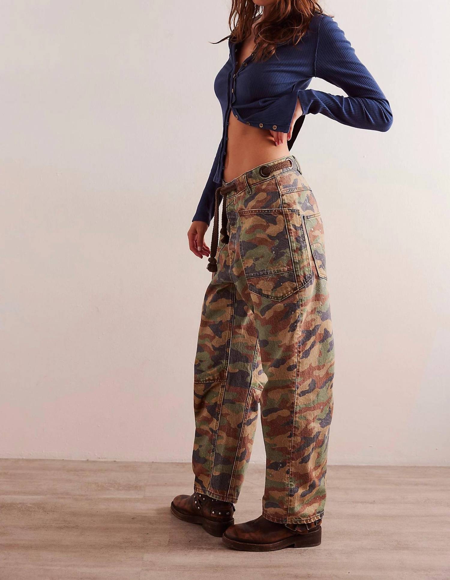Esta calça jeans feminina tem um corte largo e de cintura baixa, com pernas afuniladas, e vem em uma divertida combinação verde multicolorida com estampa camuflada. Confeccionada em 100% algodão, inclui bolsos grandes e cós com cordão e fecho de botão. Cuide bem desta calça jeans estilosa lavando-a na máquina em água fria.