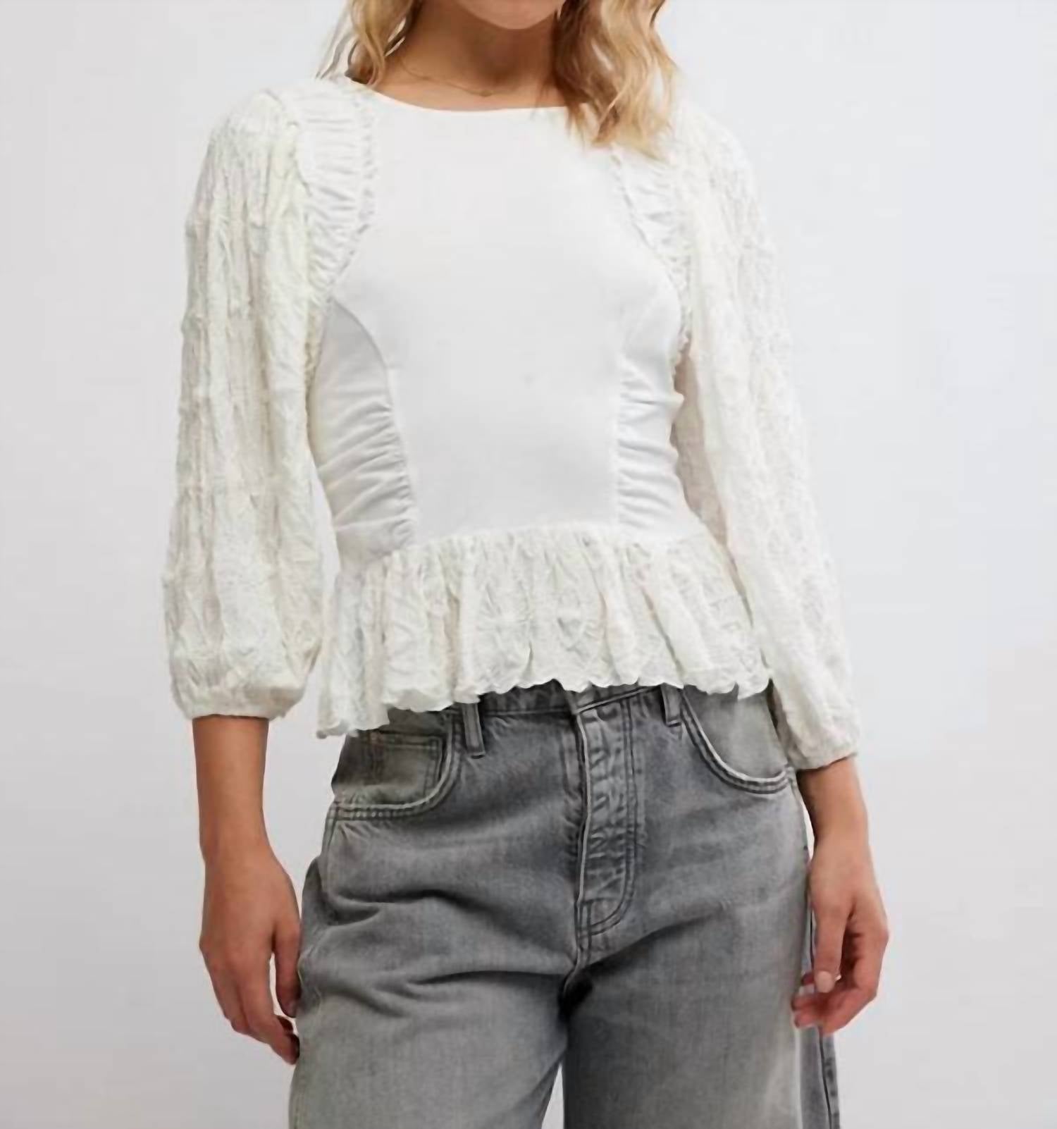Com decote redondo e mangas ¾, este top também tem detalhe franzido e abertura nas costas. Bainha com babados. Feito com estrutura tipo pulôver. Medidas tiradas do tamanho XS: Peito - 33 cm. Comprimento - 46 cm. Tecido: 94% algodão, 6% elastano. Lavar à máquina com água fria, secar no varal.