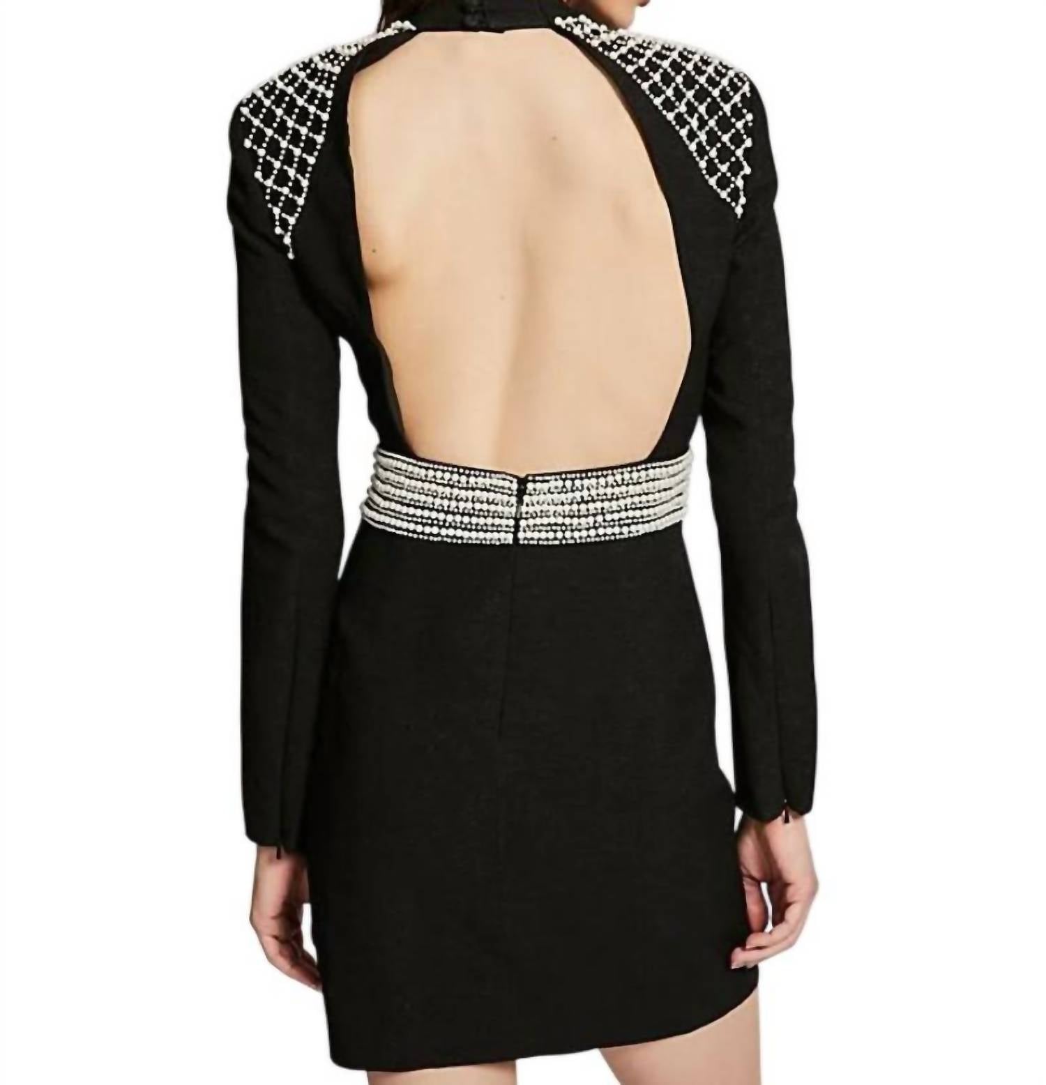 O minivestido apresenta uma silhueta estruturada com decote alto e mangas longas, adornado com aplicações de pérolas nos ombros e na cintura. Detalhe de costas abertas com fecho seguro e zíper nos destaques.
