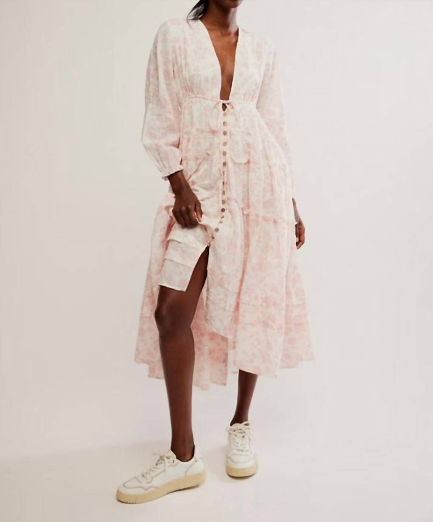O Free People Pappiet Midi é um elegante vestido rosa floral, projetado para valorizar todos os tipos de corpo com sua cintura império elegante. Com mangas longas e um elegante decote em V, este vestido de comprimento midi oferece um caimento elegante sem abrir mão do conforto. Confeccionado inteiramente em algodão de alta qualidade, inclui um fecho de amarrar estiloso para um ajuste personalizado. As instruções de cuidado especificam lavar à máquina com água fria e cores semelhantes, com a opção de passar a ferro em baixa temperatura ou lavar a seco.