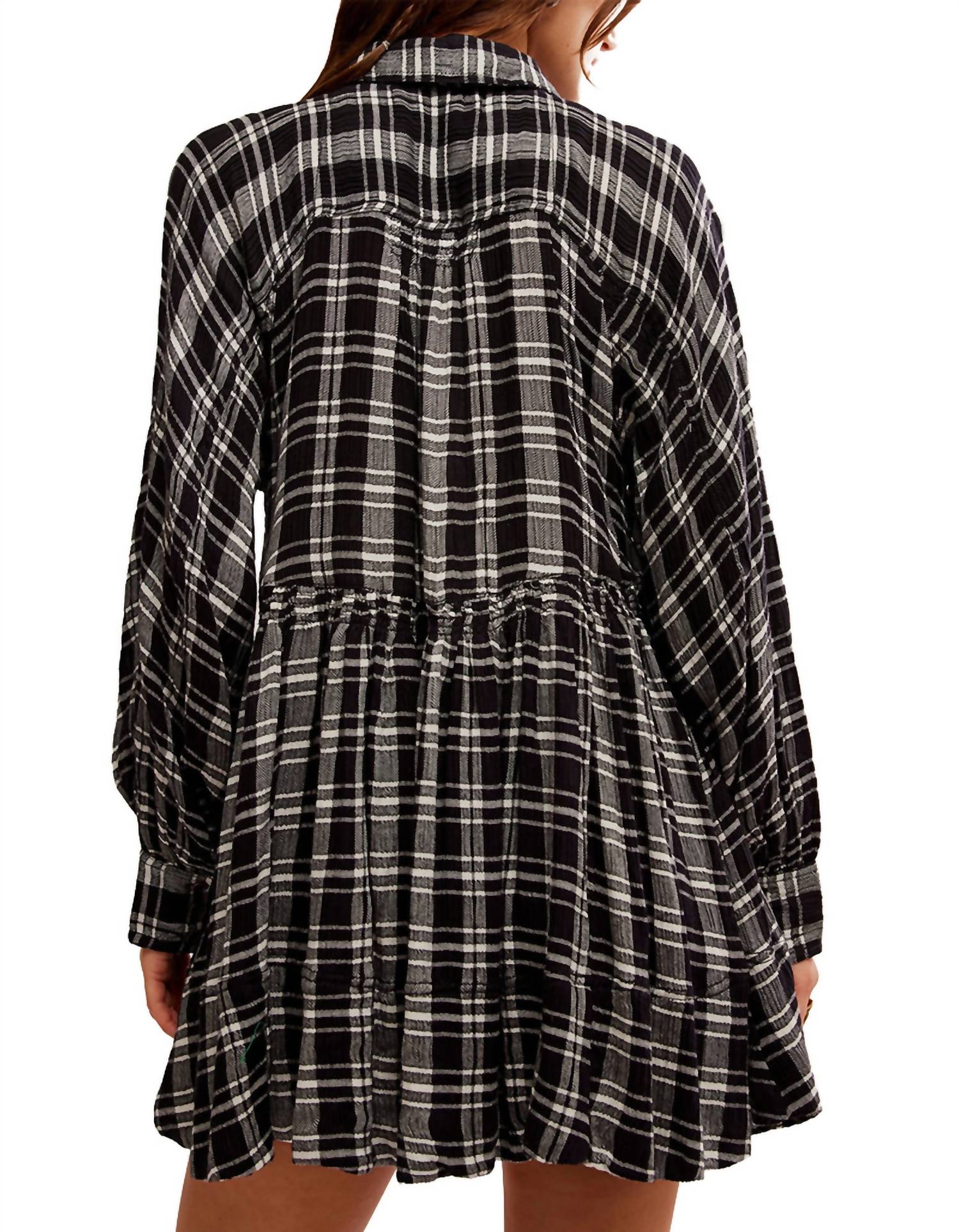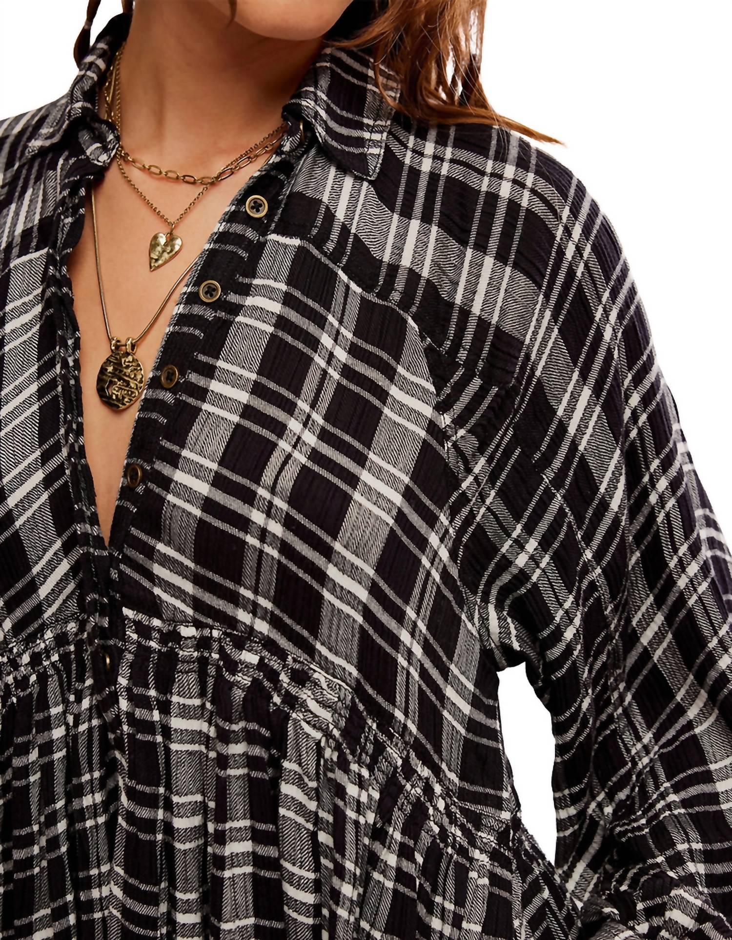 Revele seu estilo único. Peça marcante em uma combinação preta de xadrez e xadrez. Vestido com corte estilo camisa. Desenhado com mangas longas e gola careca. Comprimento mini confortável de aproximadamente 81 cm. A parte externa é composta por 88% rayon, 11% algodão e 1% elastano, com forro 100% algodão para maior conforto. O fecho é frontal com botões. Recomenda-se lavar à mão para melhor conservação.