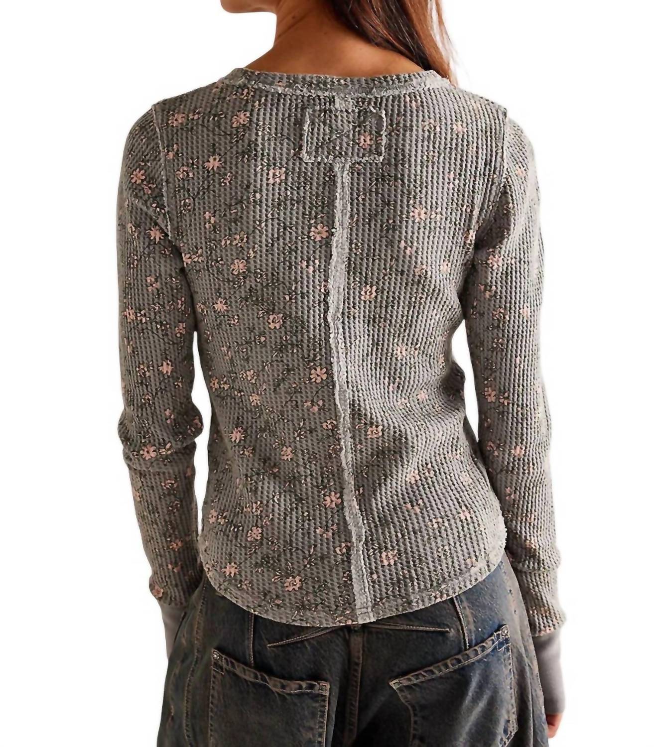 A camiseta de manga comprida perfeita que combina com quase tudo. Apresentamos a Pretty Little Thermal Top da Free People, a camada de base ideal para um estilo e conforto sem esforço. Esta camiseta de manga comprida é confeccionada em 100% algodão, garantindo maciez e respirabilidade. Com corte slim e comprimento até o quadril, possui gola careca e fecho pull-on para facilitar o vestir. A estampa floral cinza adiciona um toque de elegância, enquanto os punhos exagerados com detalhe para o polegar dão um toque moderno.
