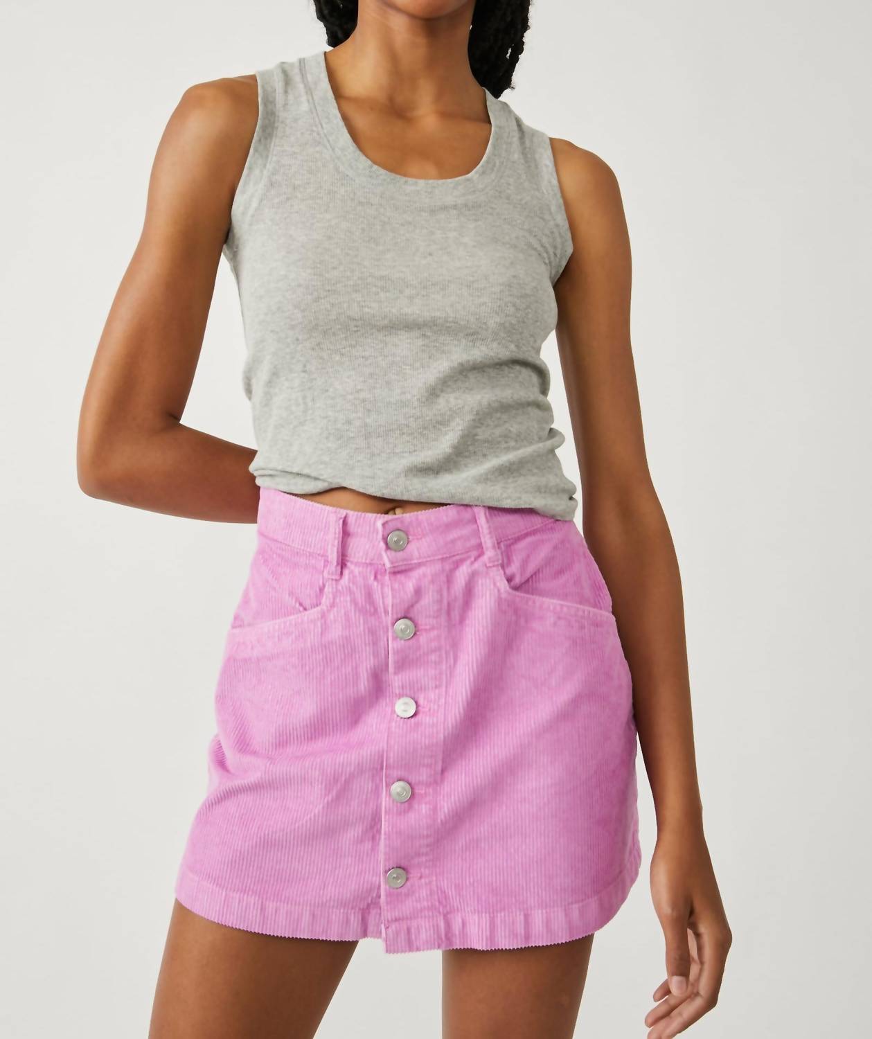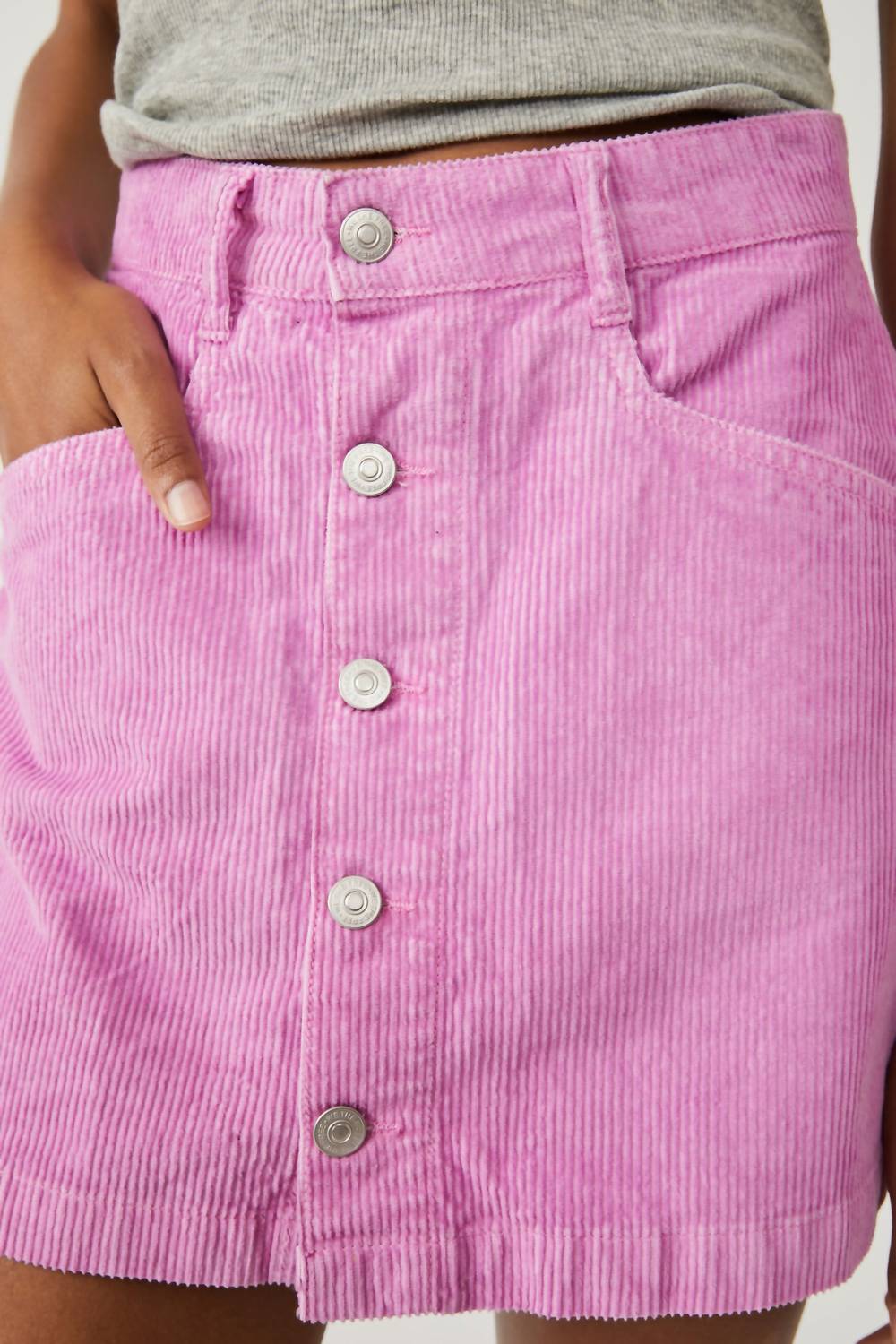 Minissaia cortoroid rosa chiclete. Mistura de algodão. Fabricada no Paquistão. Recomenda-se lavar à máquina. Fecho frontal com botões. Modelagem com 2 bolsos. Passadores de cinto. Tecido de veludo cotelê por toda a peça. Cintura: 33 cm. Comprimento: 35 cm.