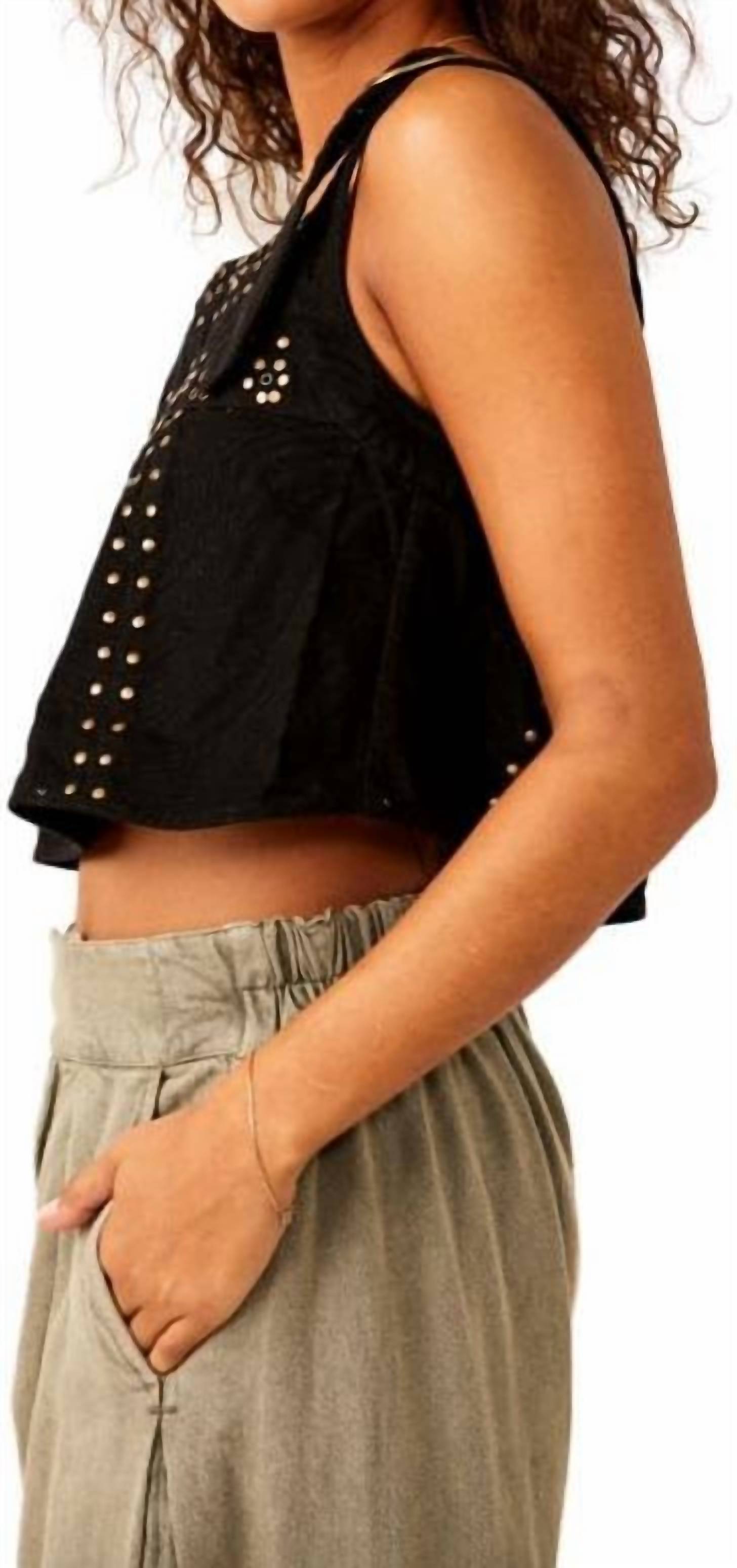 Adicione um toque despojado à sua coleção de tops com esta regata atemporal, com um corte fluido e decote quadrado, com detalhes exagerados de tachas por toda a peça para um toque especial. Modelagem: Cropped e fluida. Características: Decote quadrado, alças com fivelas, cavas caídas.