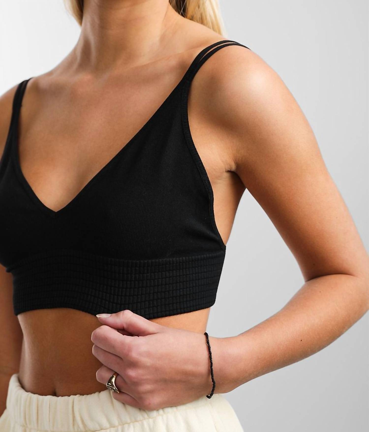 Decote em V. Alças finas duplas. Estilo pulôver. Tecido: 92% nylon e 8% elastano. Lavar à mão. A modelo tem 1,80 m e veste tamanho M/G. Fabricado nos EUA.
