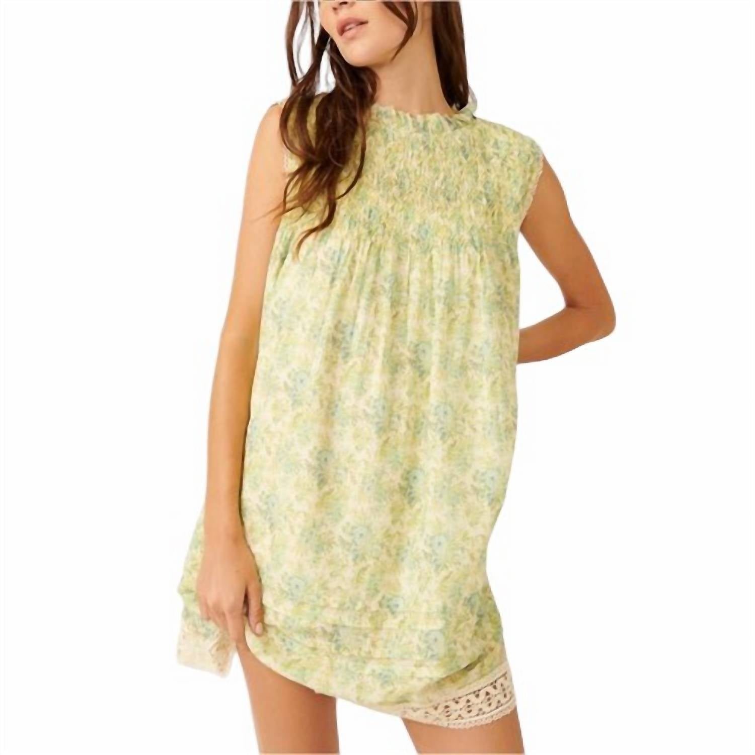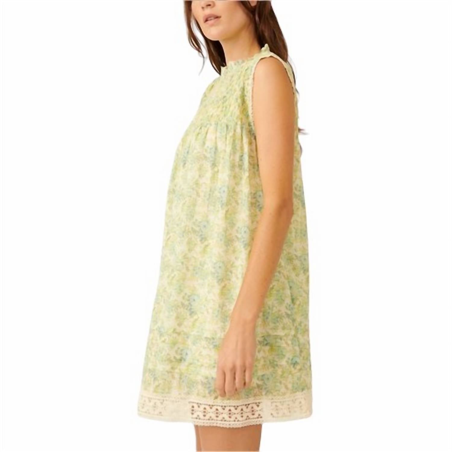 O vestido curto estampado Shea apresenta um estilo sem forma e com bainha em A, feito de uma mistura de algodão macio com detalhes estampados por toda a peça, com acabamento cru, design sem mangas, acabamento em renda contrastante e um recorte em formato de fechadura nas costas com fecho de botão; feito de 55% algodão/45% viscose e lavável à máquina.