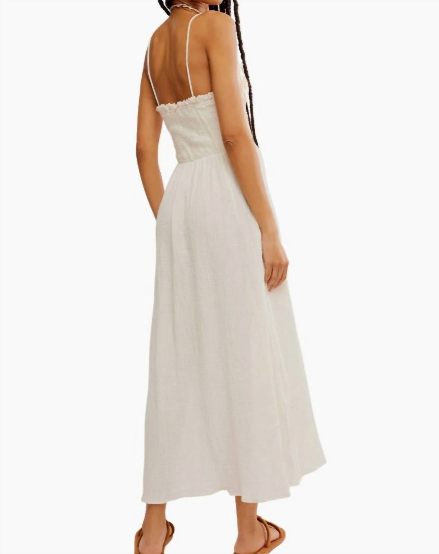 Apresentando o Vestido Midi Solid Sweet Nothings da Free People em um tom encantador Marshmallow, seu novo favorito do guarda-roupa para um estilo sem esforço. Este versátil vestido midi é meticulosamente confeccionado com o algodão mais macio, prometendo conforto sem comprometer o estilo. O corpete franzido abraça sua figura graciosamente, acentuando suas formas com um design ajustado e elegante, enquanto a bainha em A garante um caimento fácil e elegante. Um decote redondo clássico adornado com delicados babados adiciona um toque de romance e feminilidade, perfeitamente complementado pela silhueta sem mangas e alças finas e fixas para uma sensação leve e arejada. Seja para combiná-lo com sandálias elegantes para uma saída à noite ou para um look casual com suas sapatilhas favoritas, este charmoso midi é adaptável a qualquer ocasião. Beneficiando-se do luxo do tecido lavável à máquina, é tão prático quanto bonito. Abrace a elegância atemporal e a praticidade do Vestido Midi Solid Sweet Nothings e faça dele o seu favorito para o estilo em todas as estações. 100% algodão. Comprimento: 47".