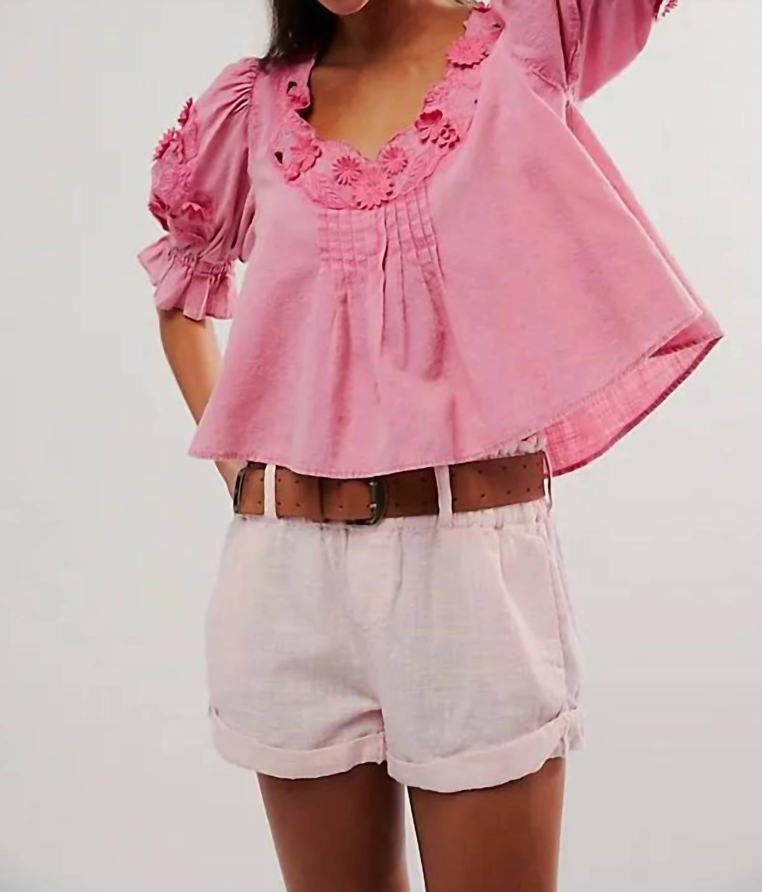 Combine este top curto com sua calça jeans de cintura alta ou saia longa favorita. Peça versátil adornada com delicados bordados florais. Top curto rosa choque. Possui mangas curtas e um decote em V profundo e charmoso, complementando perfeitamente o detalhe de decote nas costas. Confeccionado em algodão leve e macio. Oferece um caimento relaxado e levemente cropped para uma elegância casual. Possui fecho pull-on e acabamento estampado, garantindo estilo e conforto.