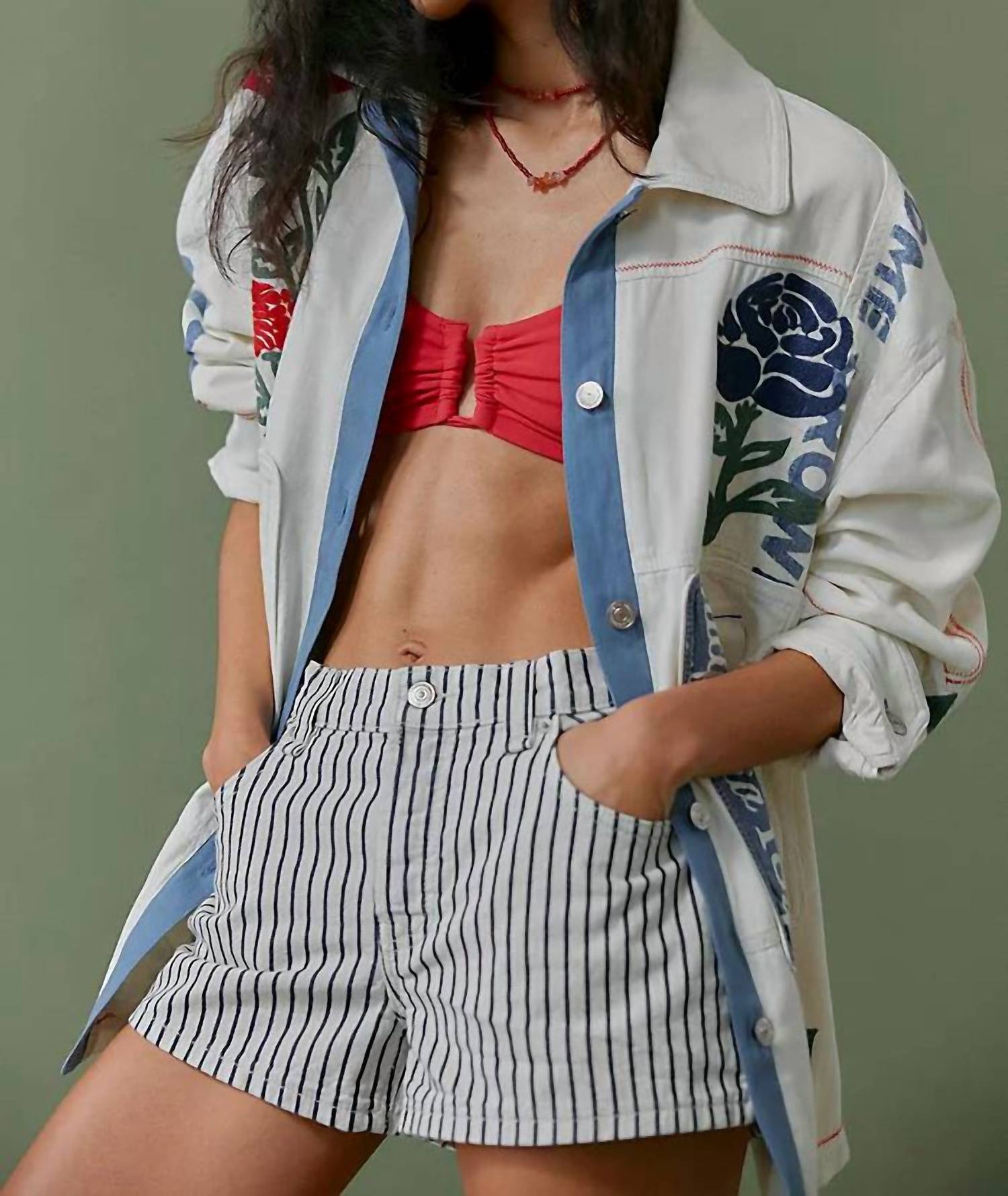 Descubra o essencial para o clima quente com estas elegantes bermudas femininas, habilmente elaboradas para proporcionar uma fusão harmoniosa de moda e funcionalidade. Eleve sua coleção de calças com o Shorts Jeans Listrado da Free People, uma peça de destaque na cor Washed Railroad. Confeccionada em algodão, esta bermuda apresenta um jeans rígido autêntico com um padrão clássico de listras ferroviárias e um caimento relaxado de cintura média. O shorts possui cinco bolsos e fecho de botão com zíper, oferecendo estilo e funcionalidade. Fácil de cuidar, basta lavar na máquina para um frescor duradouro e combinar facilmente com botas de cano alto ou tênis de quadra para opções versáteis de estilo.