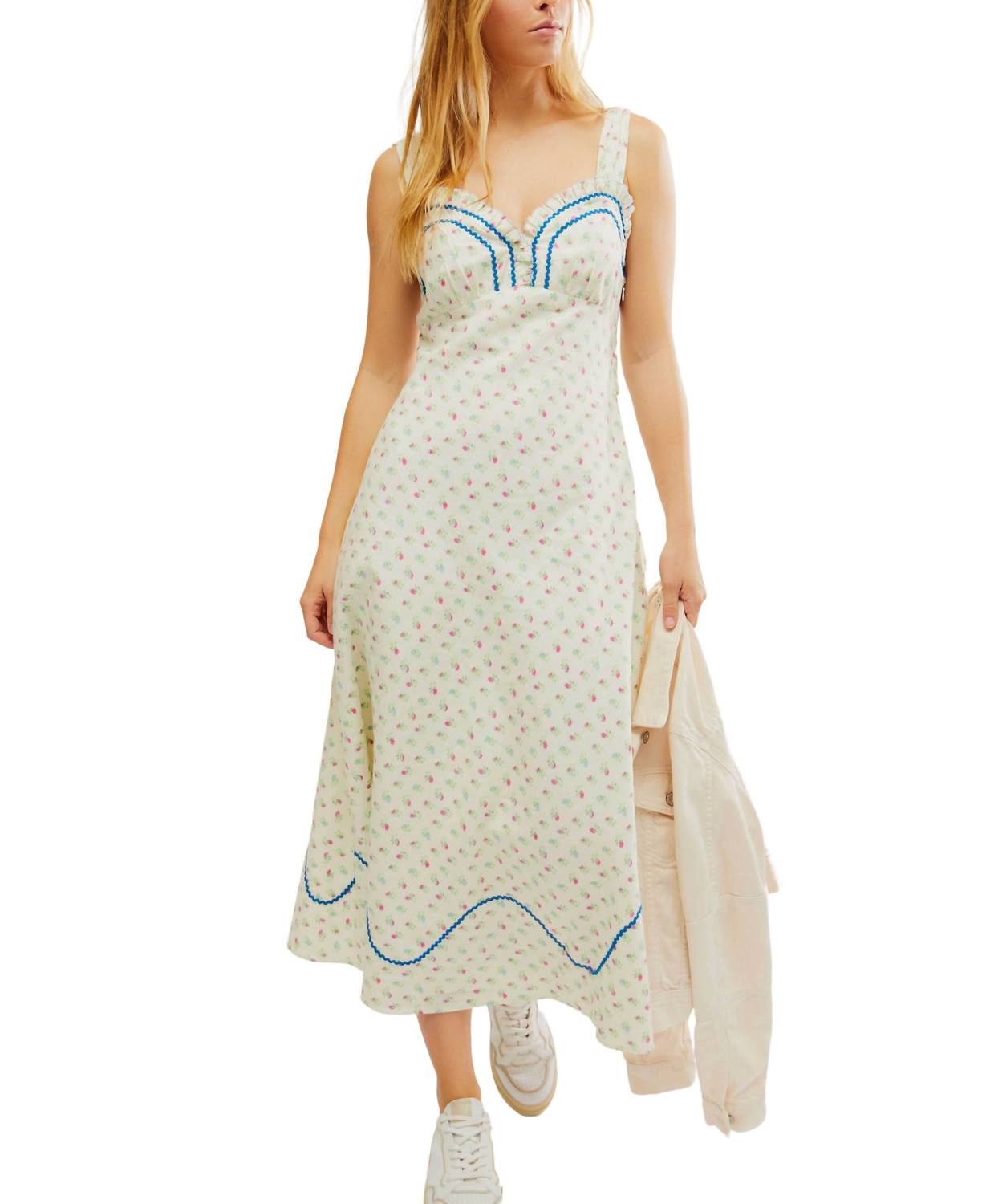 Um vestido midi tão versátil que suas opções de uso são infinitas. Apresentamos o Vestido Midi Sweethearts Ivory Combo da Free People, perfeito para ocasiões diurnas com seu extravagante design floral. Este vestido sem mangas apresenta um corte evasê elegante, com decote coração e charmoso acabamento em babados. Confeccionado em algodão macio, possui fecho de laço nas costas para um toque de estilo. As instruções de cuidado incluem lavagem à máquina com água fria, com ênfase na fácil manutenção.