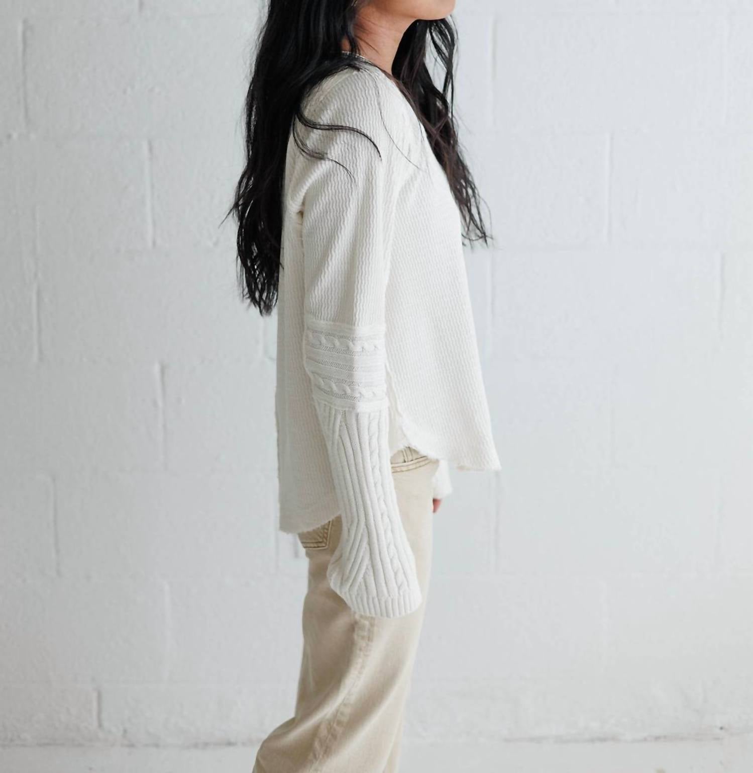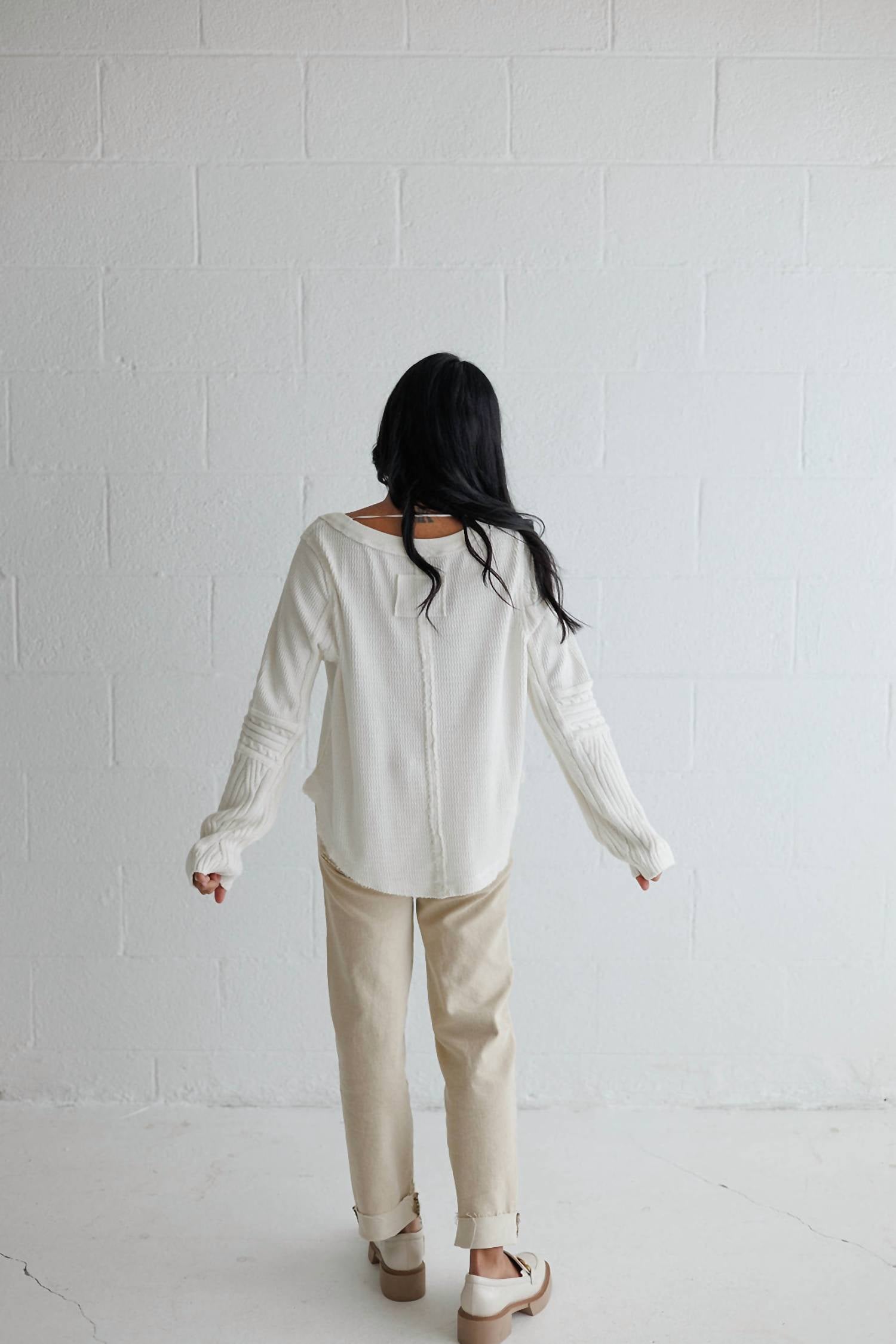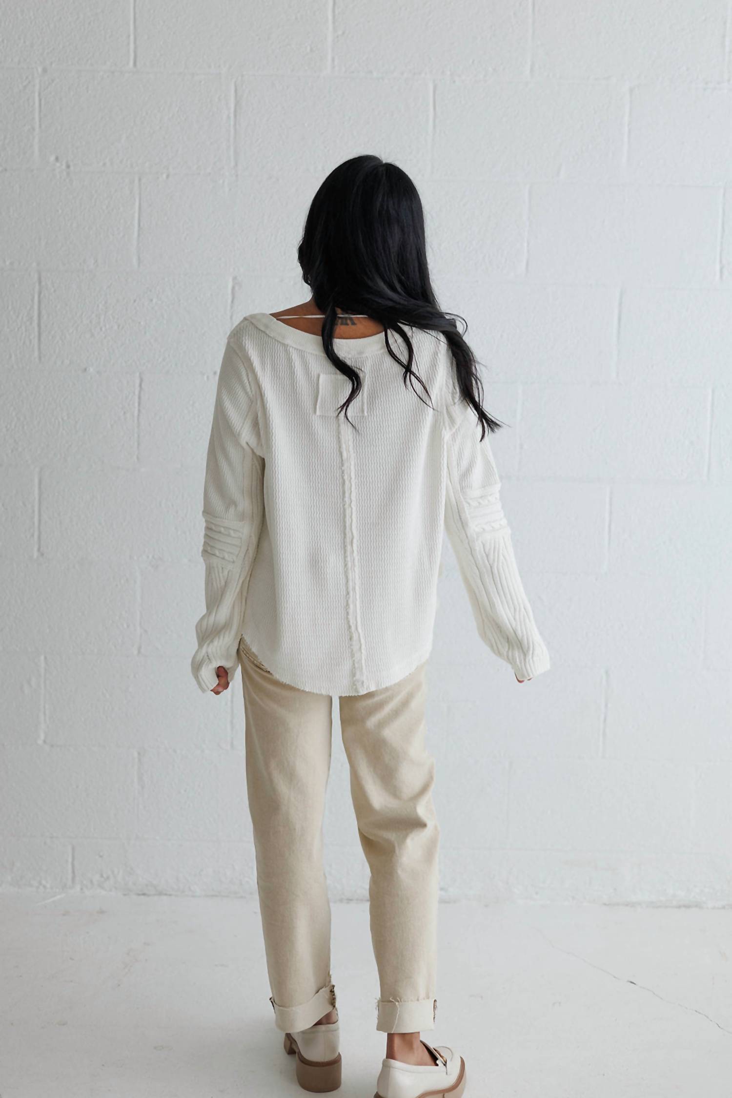 O suéter com punhos trançados e balanço traz um toque único ao seu guarda-roupa com seu caimento relaxado e corte clássico. Esta blusa de manga comprida é confeccionada em algodão texturizado, proporcionando um caimento confortável e elegante. O design apresenta decote redondo amplo, punhos trançados e detalhes de costura aparente para um visual ainda mais interessante. Fabricado na Índia, este suéter em tom marfim sólido é fácil de usar e possui um prático fecho de pressão.