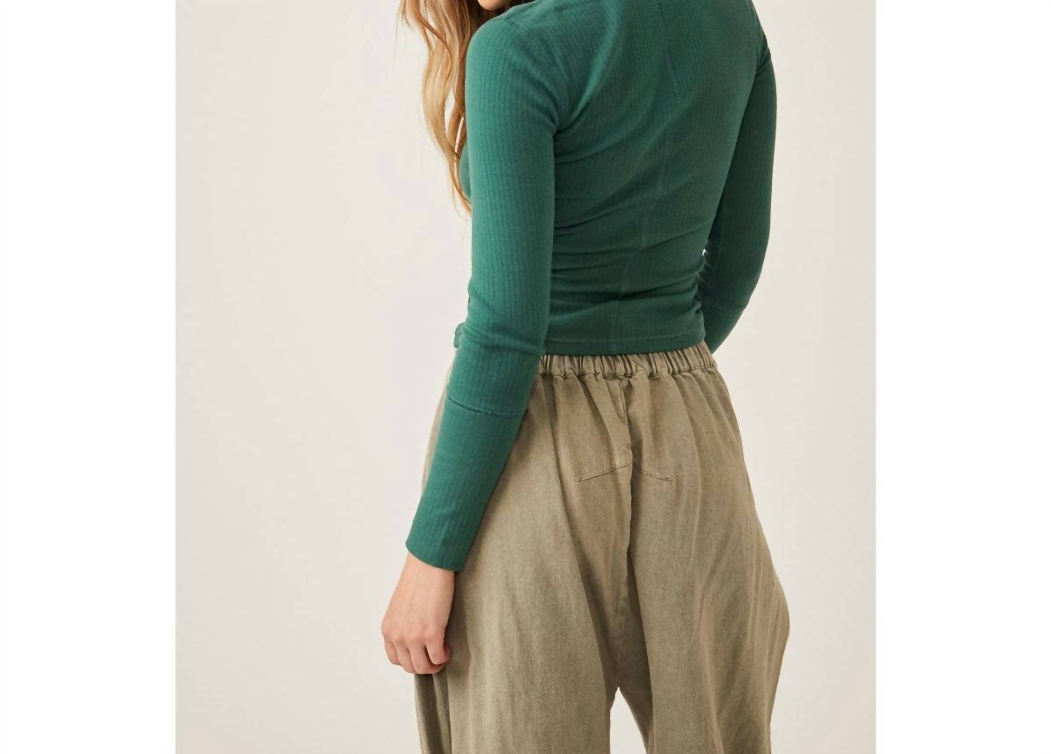 O top Free People é feito de malha canelada com gola falsa e mangas compridas. Possui modelagem ajustada e estrutura tipo pulôver, medindo aproximadamente 56 cm de comprimento. O material é uma mistura de algodão e elastano e pode ser lavado na máquina. Importado.