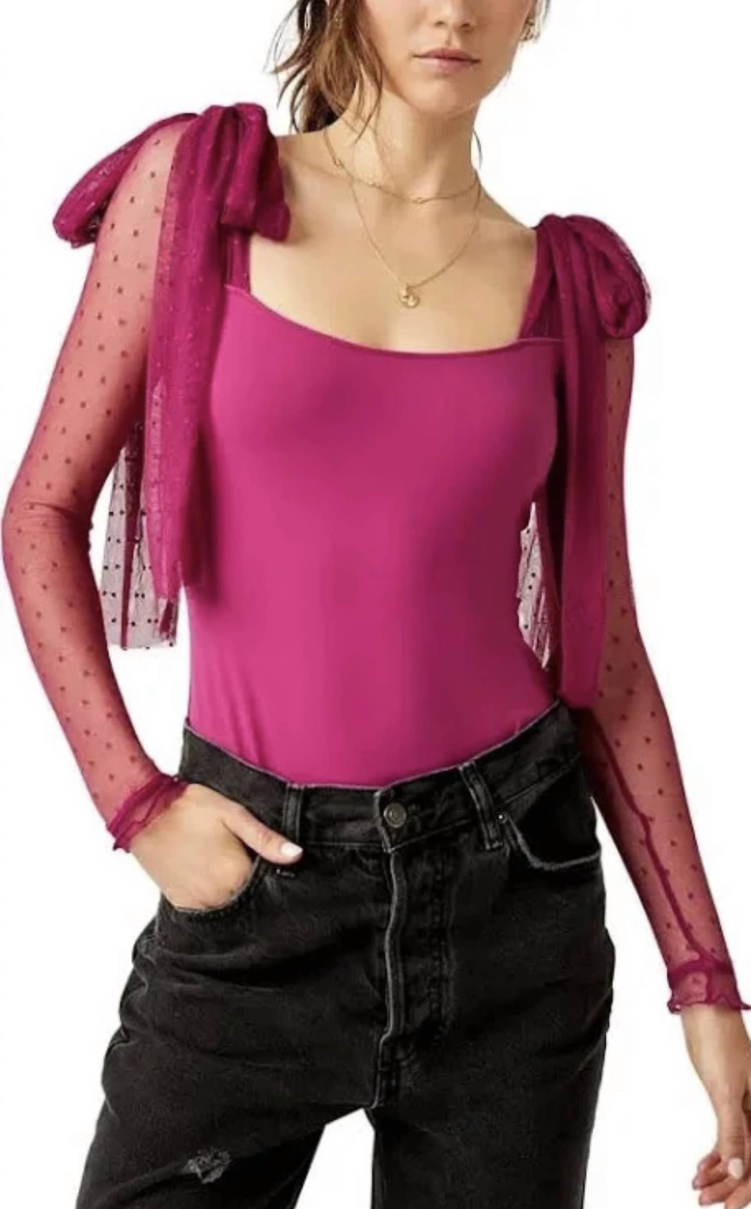 Body clássico com um toque especial, este modelo feminino de uma só peça apresenta mangas transparentes e detalhes de gravata borboleta com decote profundo nas costas.