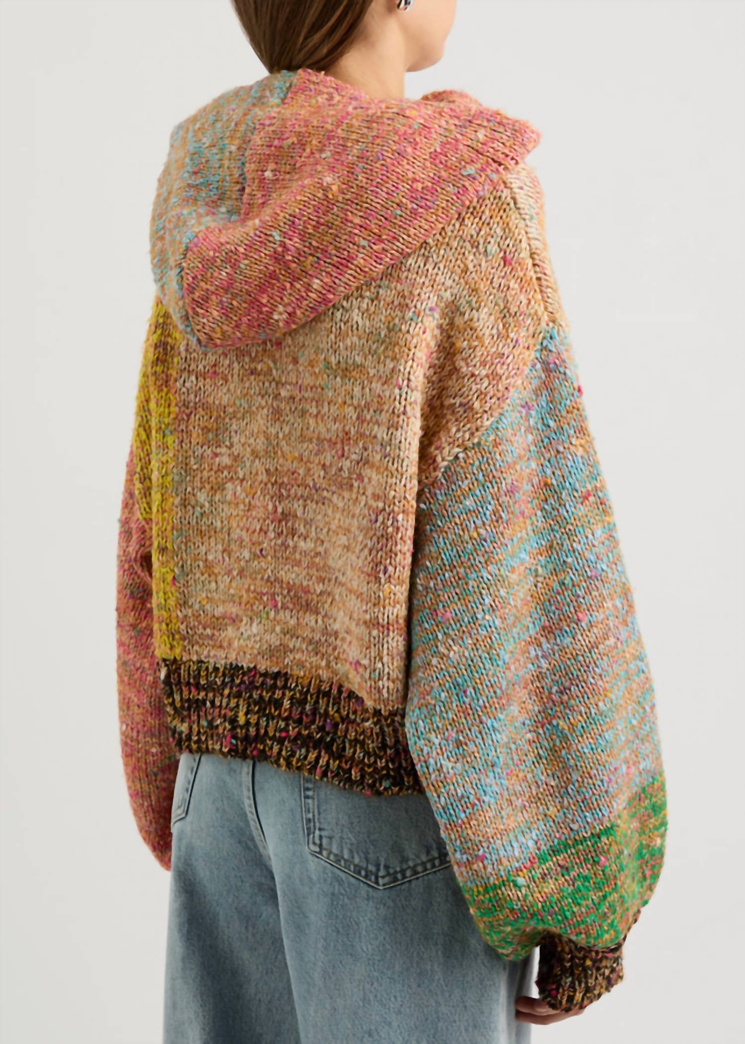 Suéter multicolorido. Confeccionado com mangas compridas, este suéter combina 52% poliéster, 31% algodão, 10% acrílico e 7% poliamida para um toque confortável. Com 53 cm de comprimento no tamanho médio, possui fecho frontal por botões e capuz fixo. Para cuidados, lave à mão e deixe secar na horizontal para manter seu charme colorido.