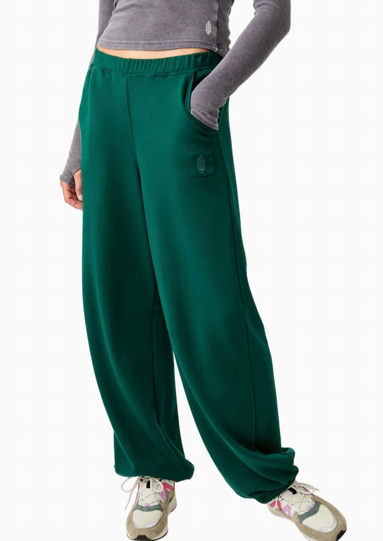Estas calças folgadas e de corte relaxado apresentam um design de cintura alta e comprimento total com tecido atoalhado macio. Cós elástico franzido, bolsos para as mãos, punhos elásticos e detalhe de aplicação do logotipo. Confeccionadas em moletinho francês 51% algodão e 49% poliéster, com cós sem esticar medindo aproximadamente 43 cm, altura de 38 cm e costura interna de 76 cm. Lavagem à máquina com água fria.