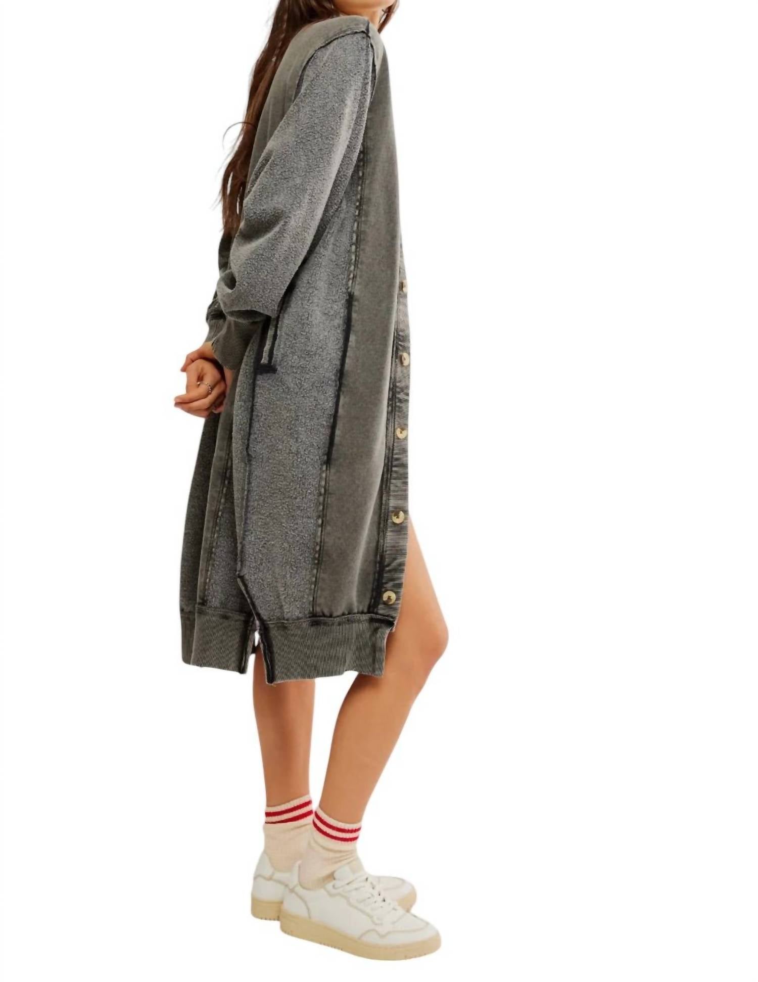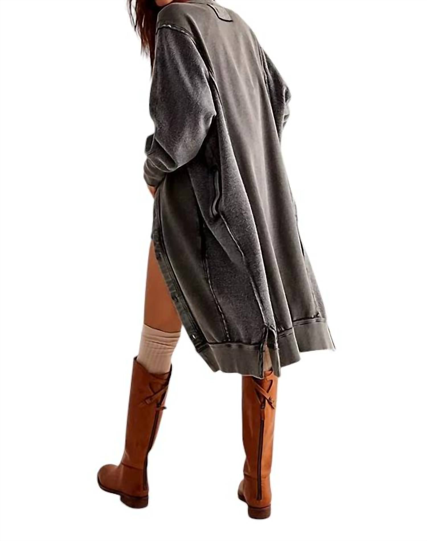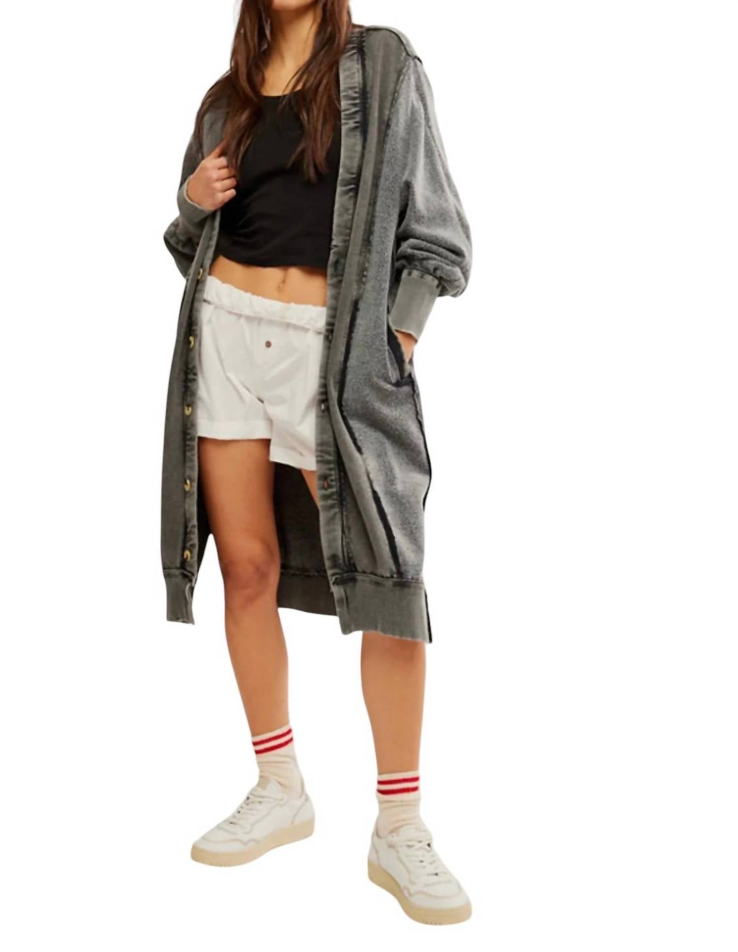 Envolva-se em uma elegância aconchegante com o Cardigan We The Free Dreamy da Free People, um item essencial em uma mistura de algodão macio. Este cardigan na altura do joelho apresenta mangas longas e caídas tipo dolman e um fecho de botão exclusivo. Composto por 90% algodão e 10% poliéster, é adornado com punhos canelados e costuras sem acabamento. Com mangas de 67 cm e comprimento total de 112 cm, é perfeitamente lavável à máquina e elegante na cor preta lavada.
