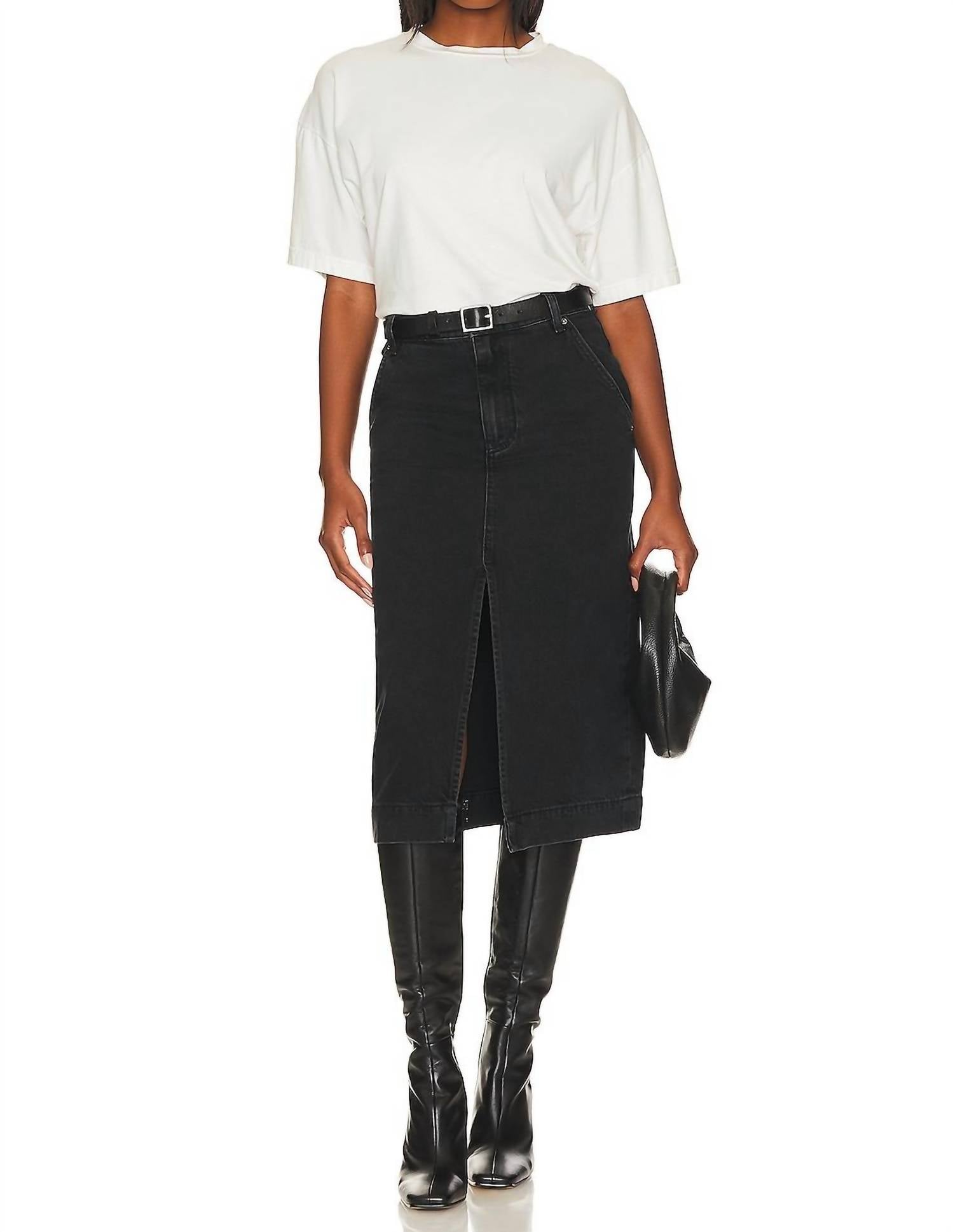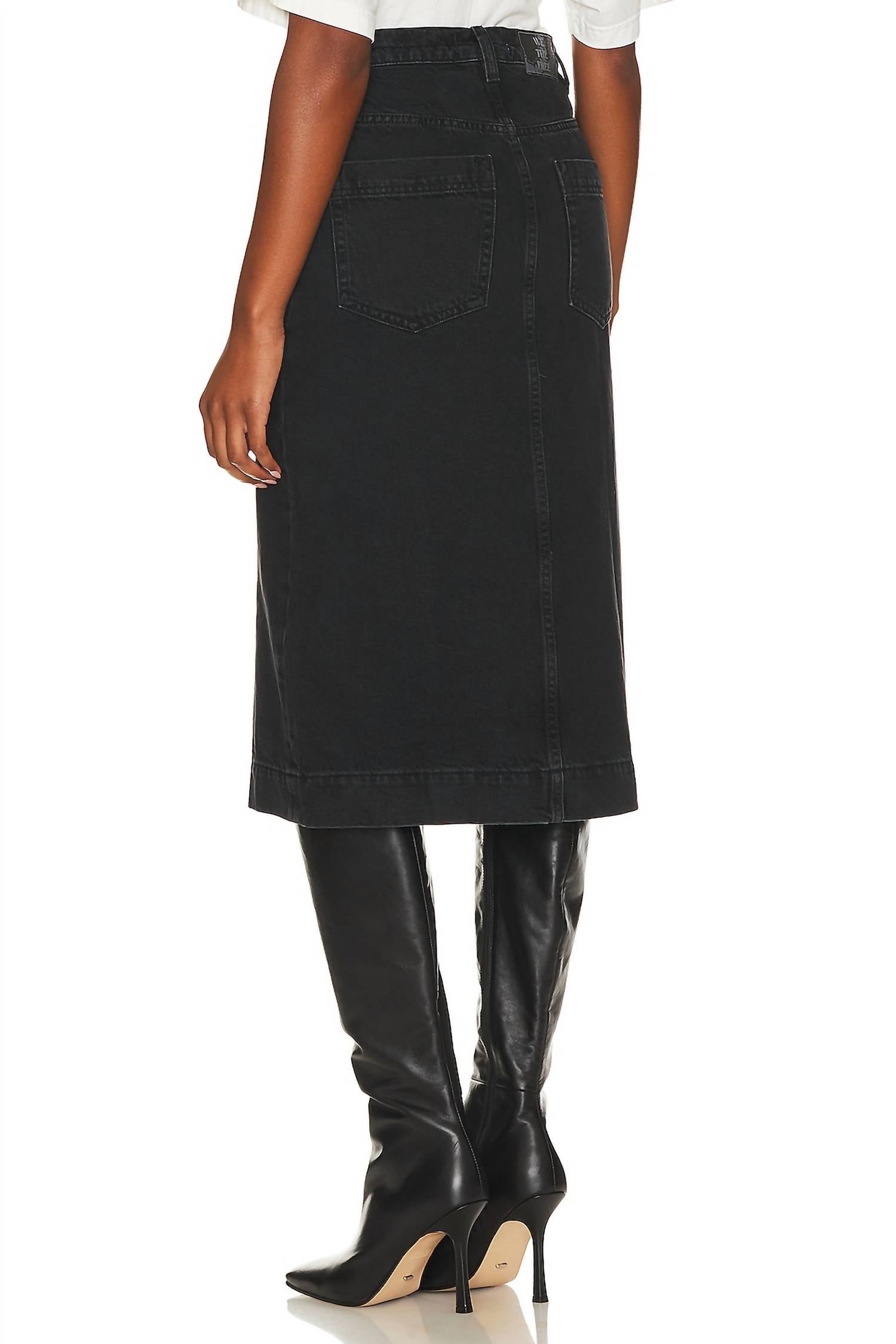 Coloque sua camiseta favorita dentro desta saia de comprimento midi para um visual descolado e descontraído. Apresentamos a Saia Midi Jeans Wild Roses da Free People, uma saia preta lisa confeccionada para versatilidade e estilo. Esta saia de 35 cm apresenta tecido jeans rígido e estilo clássico de 5 bolsos com uma fenda frontal elegante. Feita em 100% algodão, possui braguilha com zíper e fecho de botão para um ajuste seguro. Originária da Turquia, é lavável à máquina para um cuidado sem esforço.