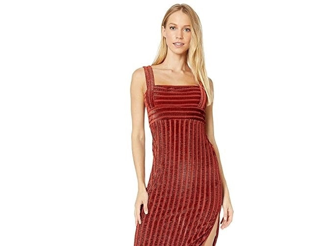 Fabricação em veludo|Fabricação elástica que envolve o corpo|Em silhueta coluna para um visual alongado|Fenda na altura da coxa na costura lateral.