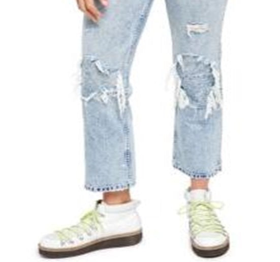 Calça jeans bootcut de denim rígido com joelhos estourados | * Cintura alta * Detalhe de fenda na bainha * Detalhes desgastados * Estilo de cinco bolsos * Fecho de botão e zíper
