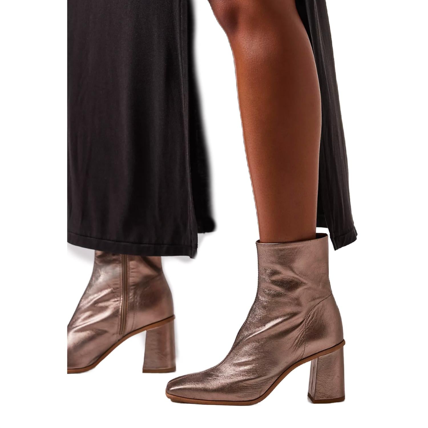 Apresentamos a bota feminina Sienna da Free People em um tom bronze ousado, essencial para um guarda-roupa chique e despojado. Estas botas de cano curto são habilmente confeccionadas em Portugal com couro, oferecendo um estilo slip-on aprimorado por um fecho de zíper lateral. Desenhadas com salto bloco alto de 7,6 cm e bico quadrado, elas oferecem estilo e conforto com palmilha e forro de couro. Perfeitas para dar um toque especial a qualquer look, estas botas chamam a atenção na transição do dia para a noite sem esforço.