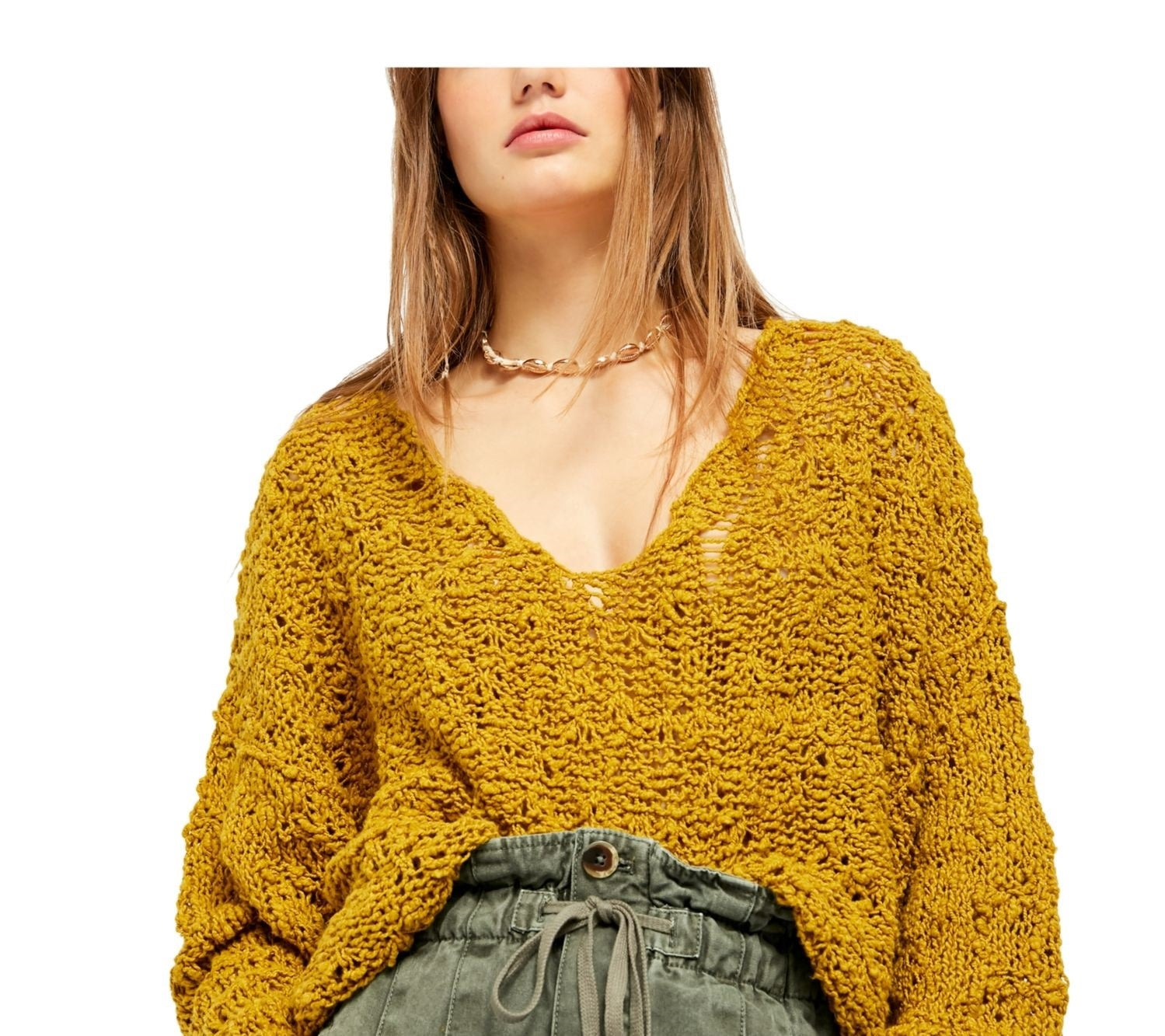 22 1/2" de comprimento (tamanho médio) | Decote em V | Mangas compridas | Frente: 55% algodão, 27% poliéster, 18% acrílico; costas: 82% algodão, 18% acrílico