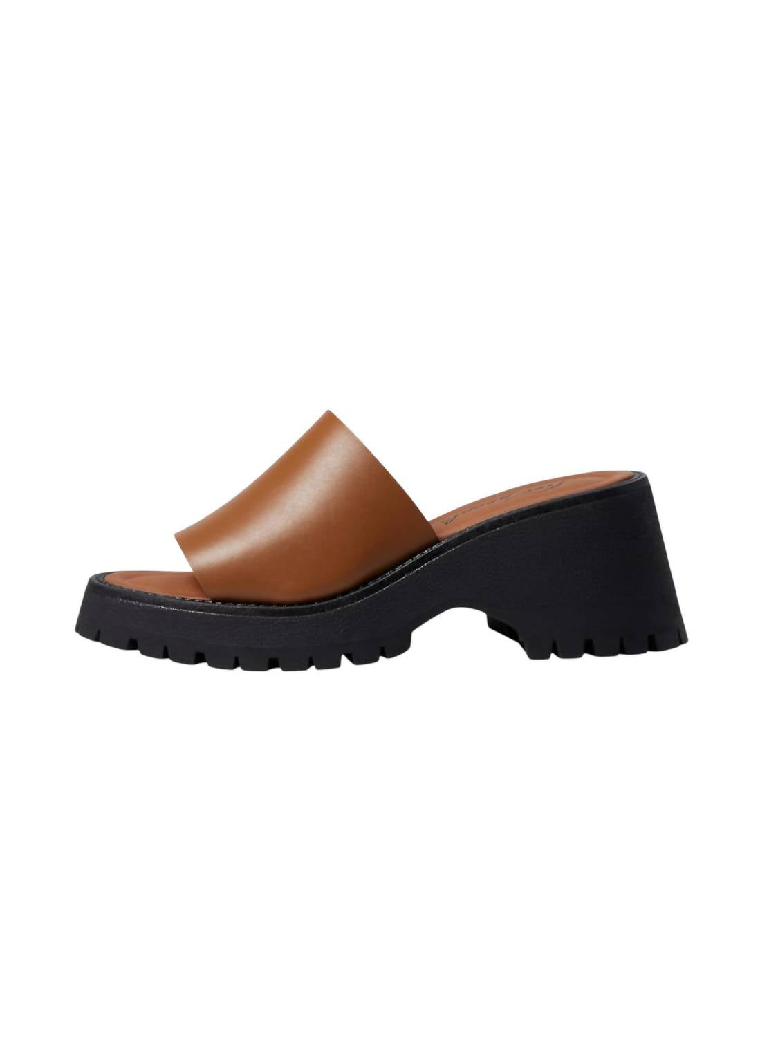 Cabedal em couro. Forro sintético. Palmilha sintética acolchoada. Modelo fácil de calçar. Biqueira arredondada e aberta. Salto robusto inspirado em plataforma. Solado sintético com sulcos. Fabricado na Itália.
