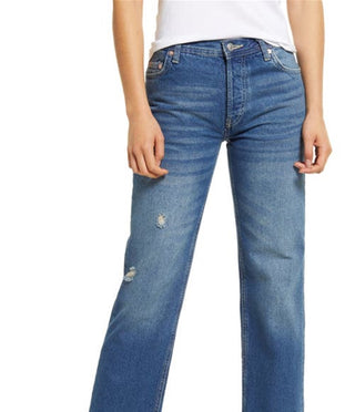 Calça jeans feminina Maggie com perna reta e tornozelo rasgado, azul, tamanho 28