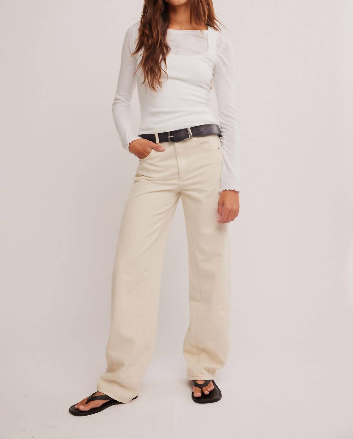 Conheça a Aster Straight Jean da Free People, sua nova peça-chave para um guarda-roupa moderno em um tom creme chique. Esta calça jeans feminina de perna reta apresenta cintura alta, caimento regular e folgado no quadril e na coxa, além de uma abertura inferior de 40 cm, tornando-a perfeita para streetwear e festivais de música. Confeccionada em 100% algodão, a peça rígida e que não estica garante que a calça mantenha seu formato e desbote com o tempo. O fechamento é feito por um zíper prático, com instruções de cuidado que recomendam lavagem à máquina e secagem em tambor.