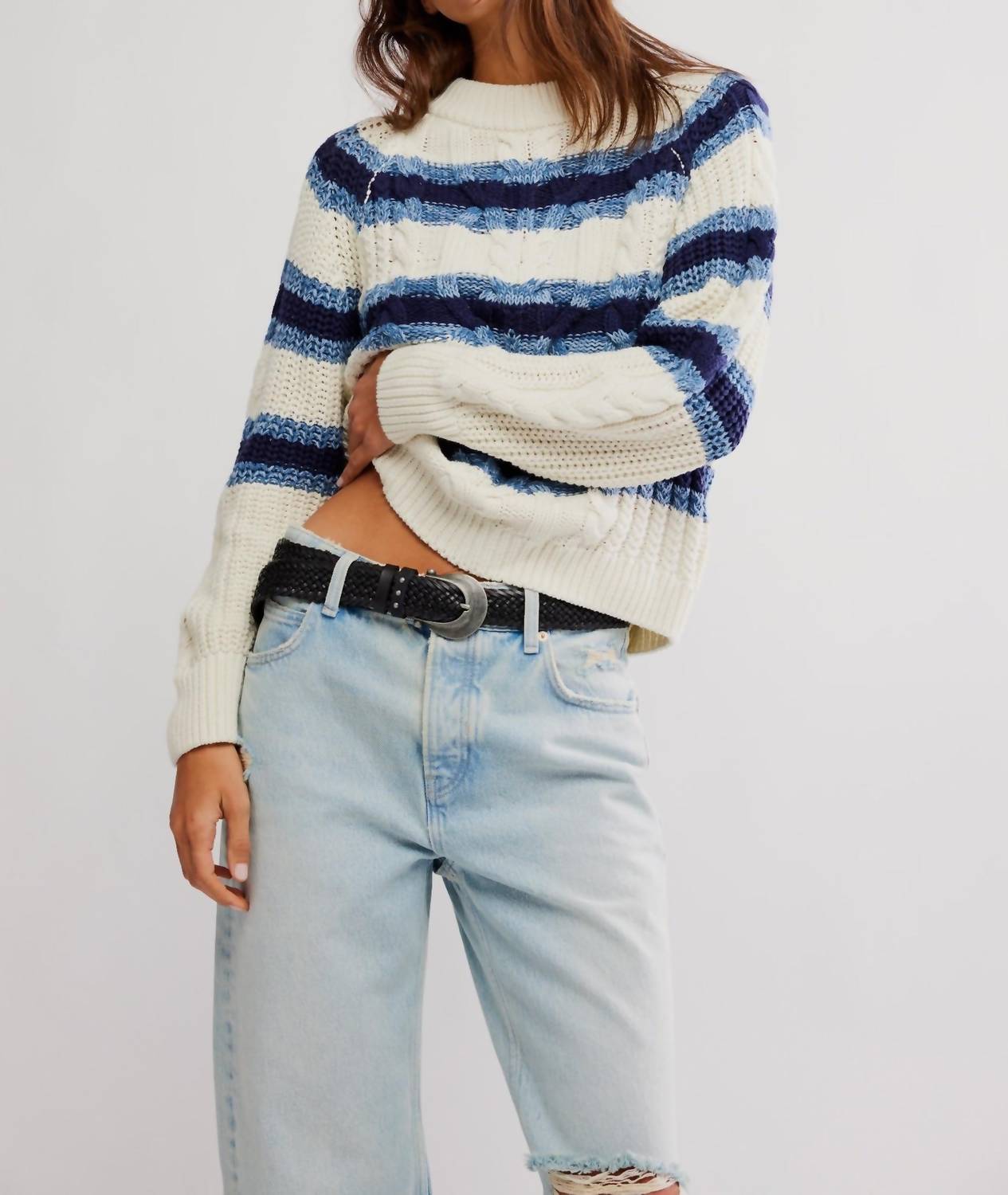 Stay warm and stylish in this versatile and effortlessly cool knitwear staple. Wear it alone or layered, it's the perfect sweater for the season and you'll wish you had it in every color. Introducing the Frankie Cable Striped Pullover Sweater by Free People, a standout piece in an ivory combo crafted for chic, cozy days. Featuring long sleeves and a distinctive striped pattern, this sweater is made from 100% cotton for a comfortable fit. This cropped pullover with a classic crewneck and drop shoulders offers a stylishly relaxed vibe with its cable knit design. Closure: Pull-on style. Care: Machine washable. Imported. Perfectly suited for pairing with high-waisted bottoms, this top is your go-to for adding a trendy touch to any outfit.