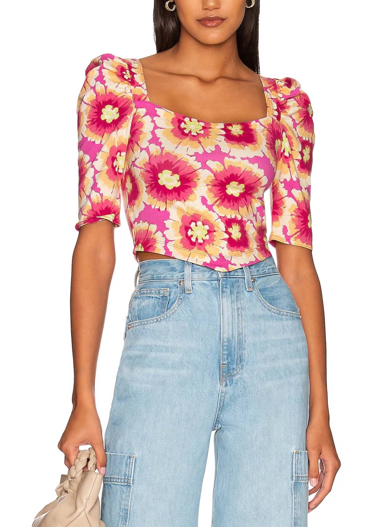 Decote quadrado. Detalhe de alças cruzadas nas costas. Mangas levemente bufantes. Tecido jersey elástico com estampa floral.