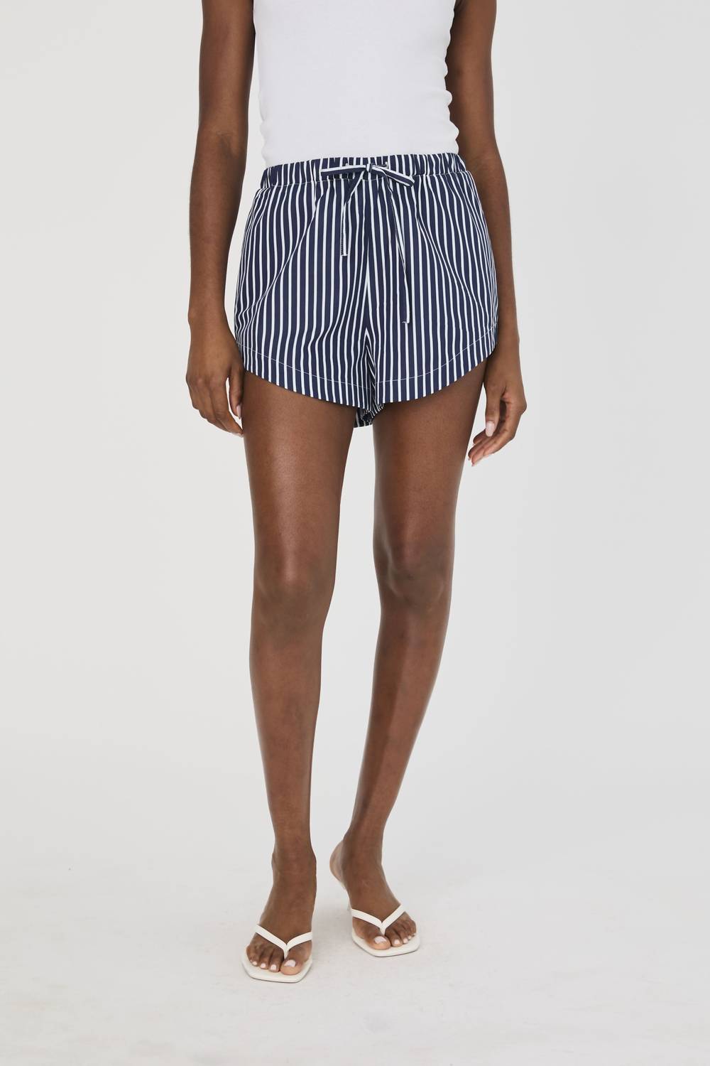 Descubra o short Alexis Cotton da FRENCH CONNECTION, perfeito para dar um toque de frescor e estilo ao seu guarda-roupa. Confeccionado em algodão puro, este short de cintura alta apresenta uma elegante estampa listrada em marinho e branco. Com bolsos práticos, oferece uma opção funcional e elegante para passeios casuais. O fecho de amarrar proporciona um ajuste ajustável, garantindo conforto durante todo o dia.