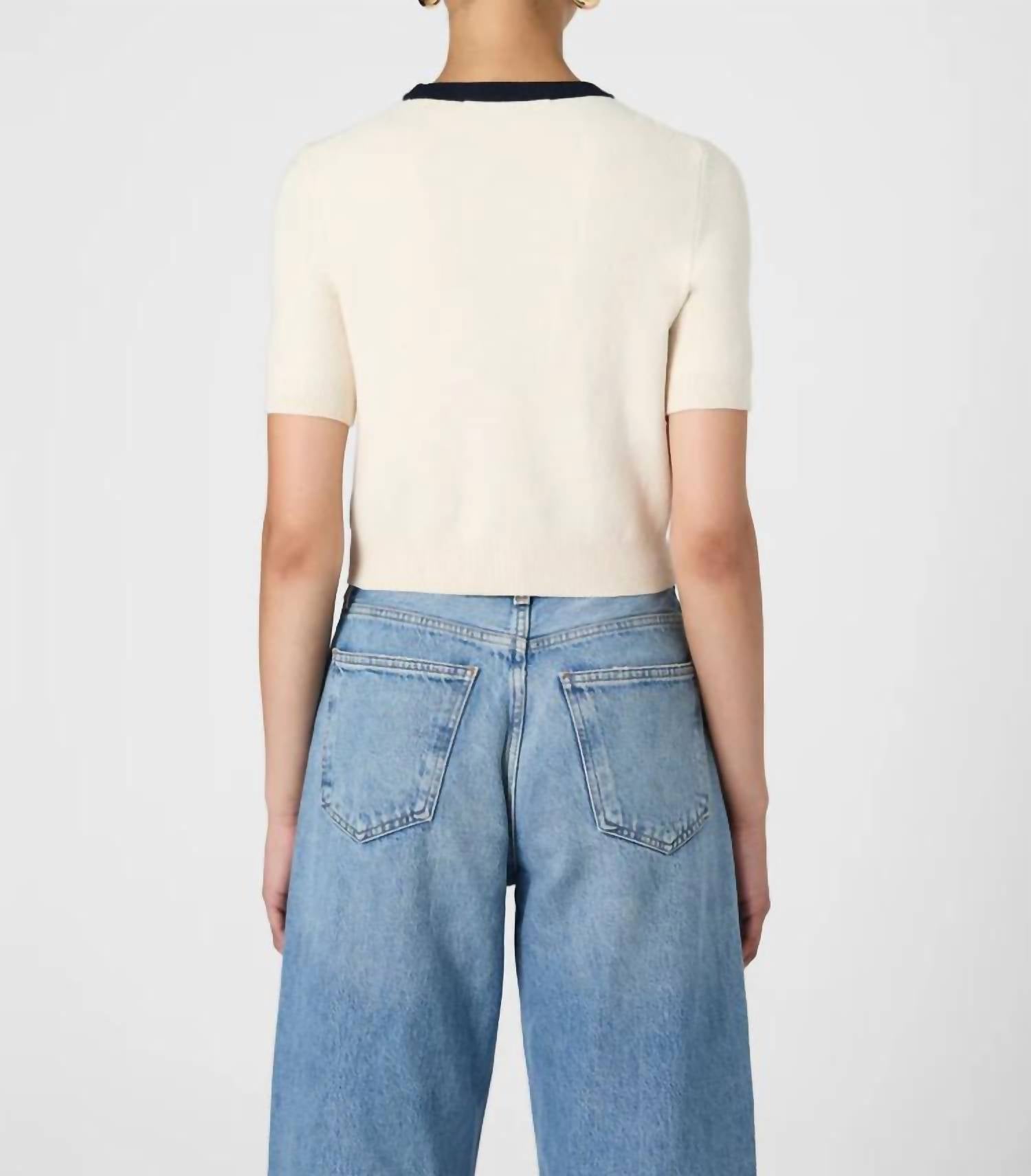 Suéter de malha. Malha leve e macia. Gola com acabamento em branco. Dois bolsos frontais. Mangas curtas. Decote redondo. Acabamentos canelados. Caimento clássico.