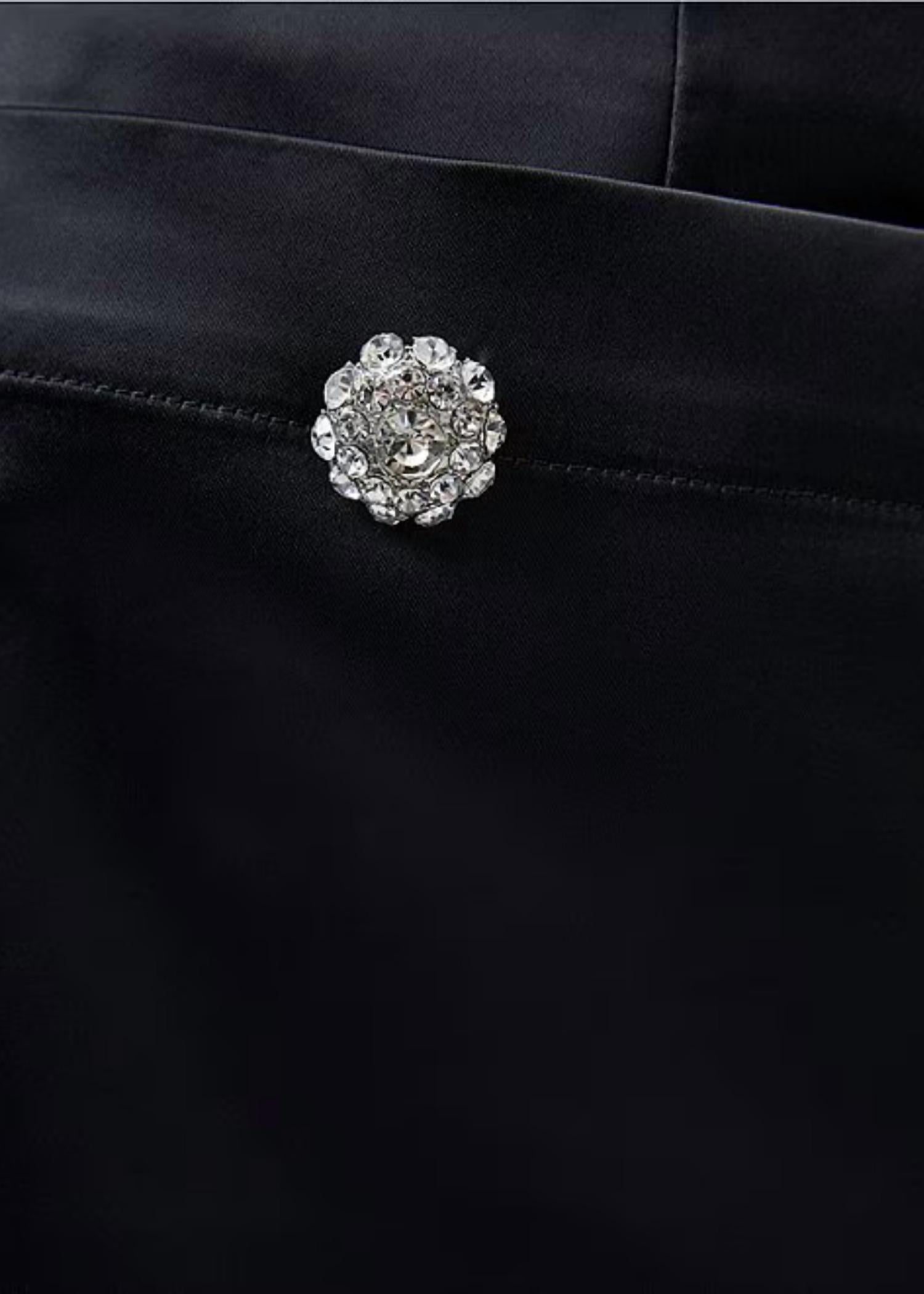 Minissaia. Tecido acetinado. Textura suave. Organza e transparência. Design estruturado. Corte em A. Botões de strass. Camada dupla.