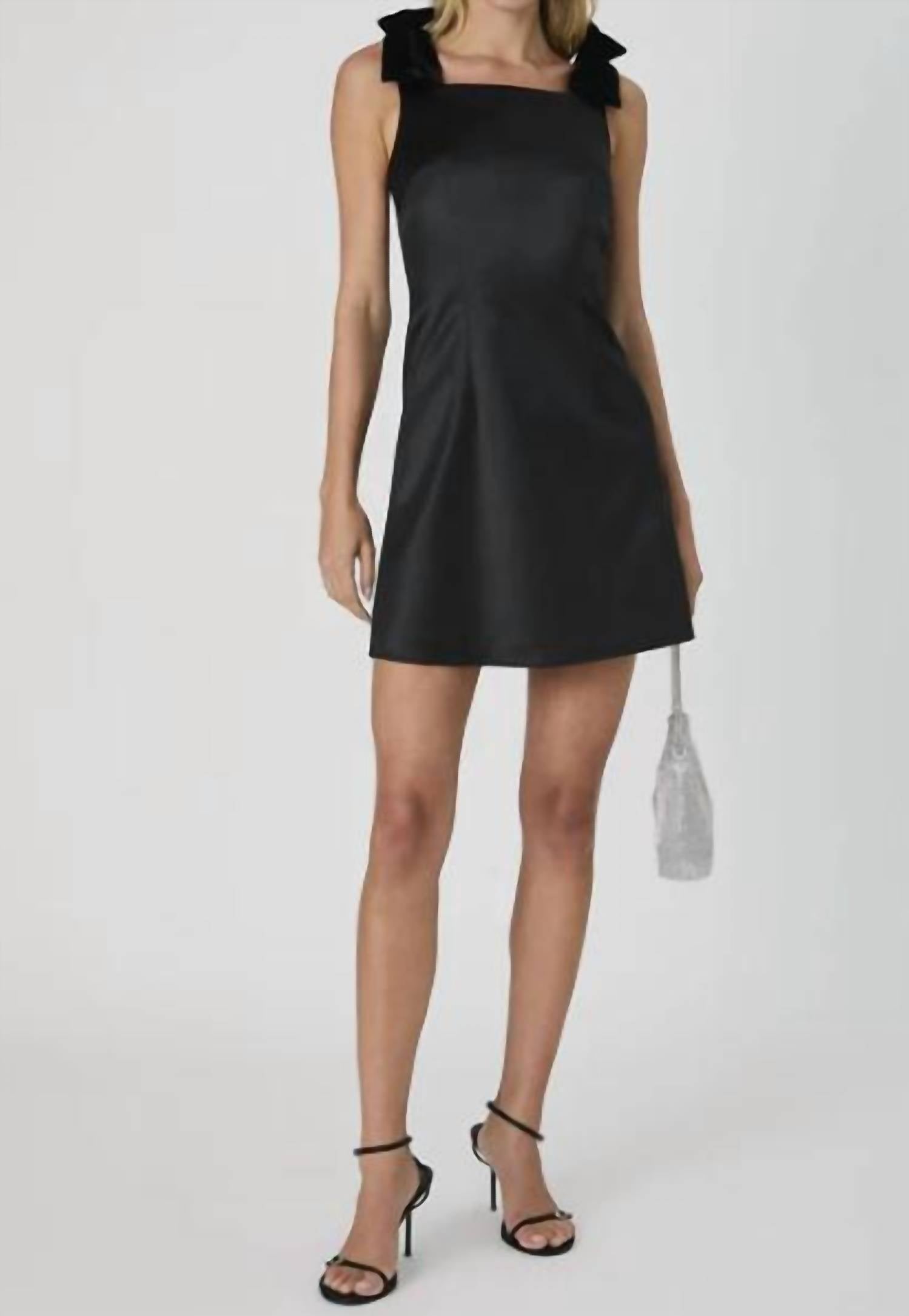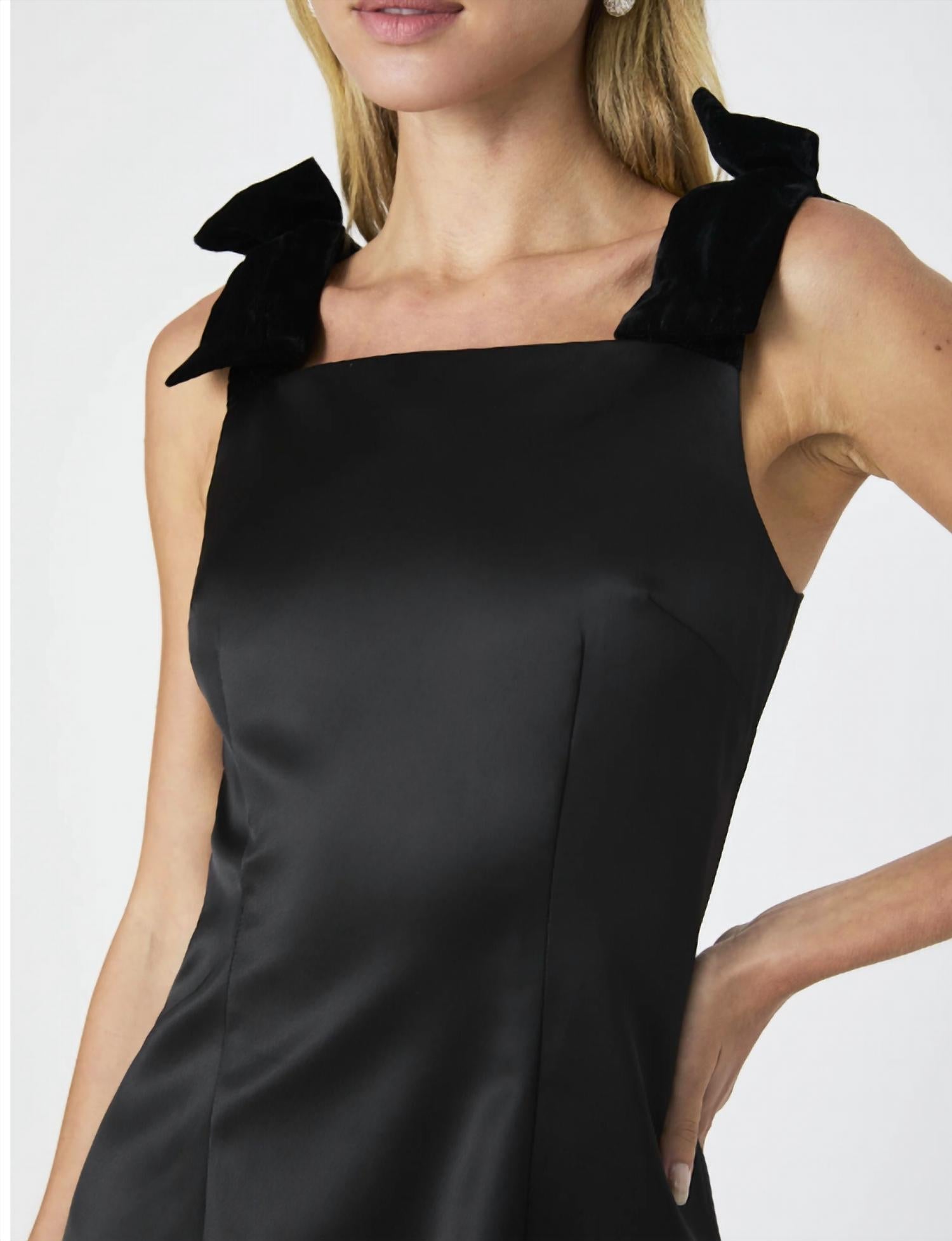 Apresentamos o Vestido Carey com Decote Quadrado da FRENCH CONNECTION, um vestido sem mangas de tirar o fôlego em cetim preto liso. Este minivestido apresenta uma silhueta evasê elegante, com corpete justo e decote quadrado atemporal. Alças de laço de veludo adicionam um toque divertido, enquanto o fecho de zíper nas costas garante um ajuste perfeito. Perfeito para festas ou encontros românticos, este vestido é forrado para conforto e estilo. Sierra está usando tamanho 2.