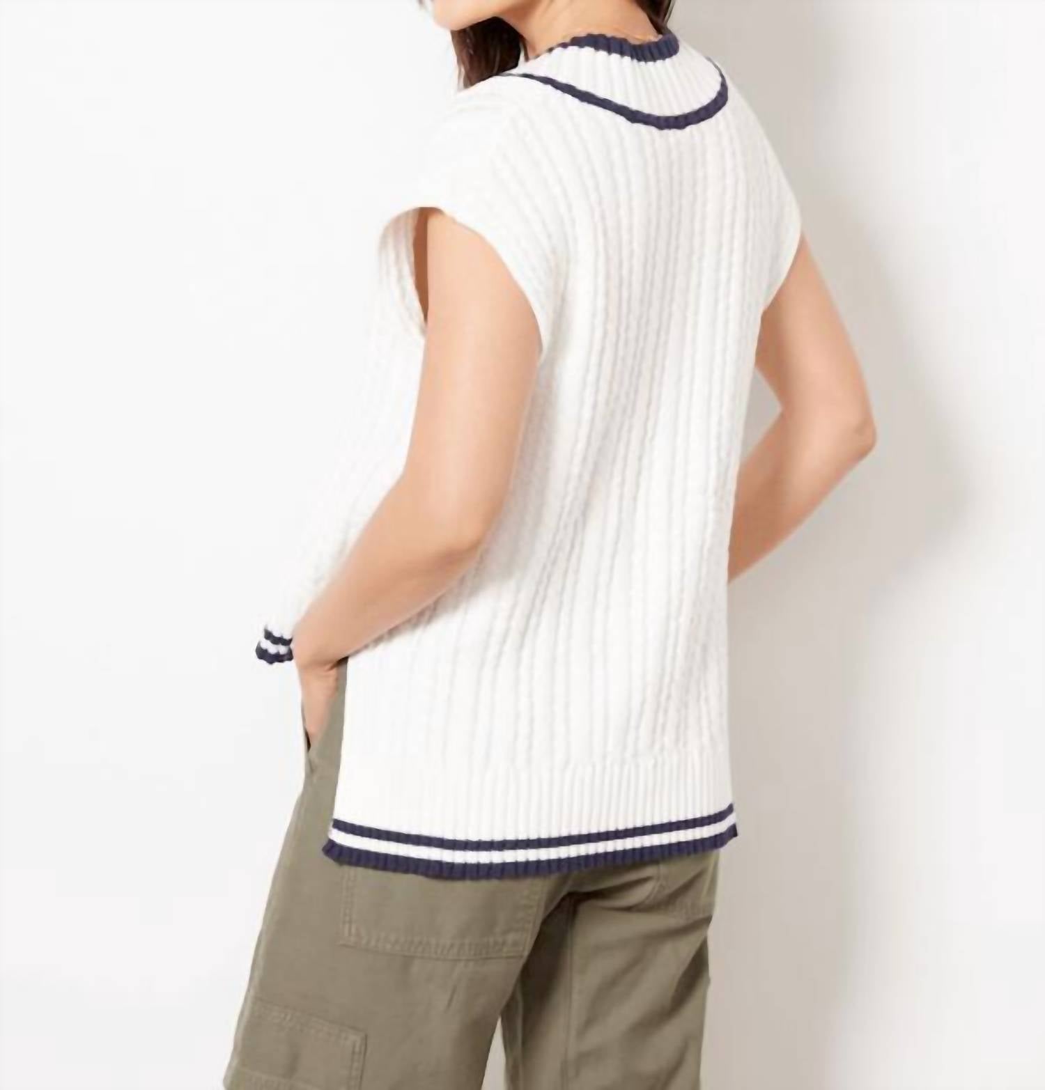 Featuring cap sleeves and a textured cable knit pattern, white and navy sweater vest exudes minimalist charm. Crafted from soft cotton. Boasts varsity stripes at the v-neckline and a ribbed hem for an added touch of sophistication. Offers a convenient pull-on closure. Recommended to be hand washed.
