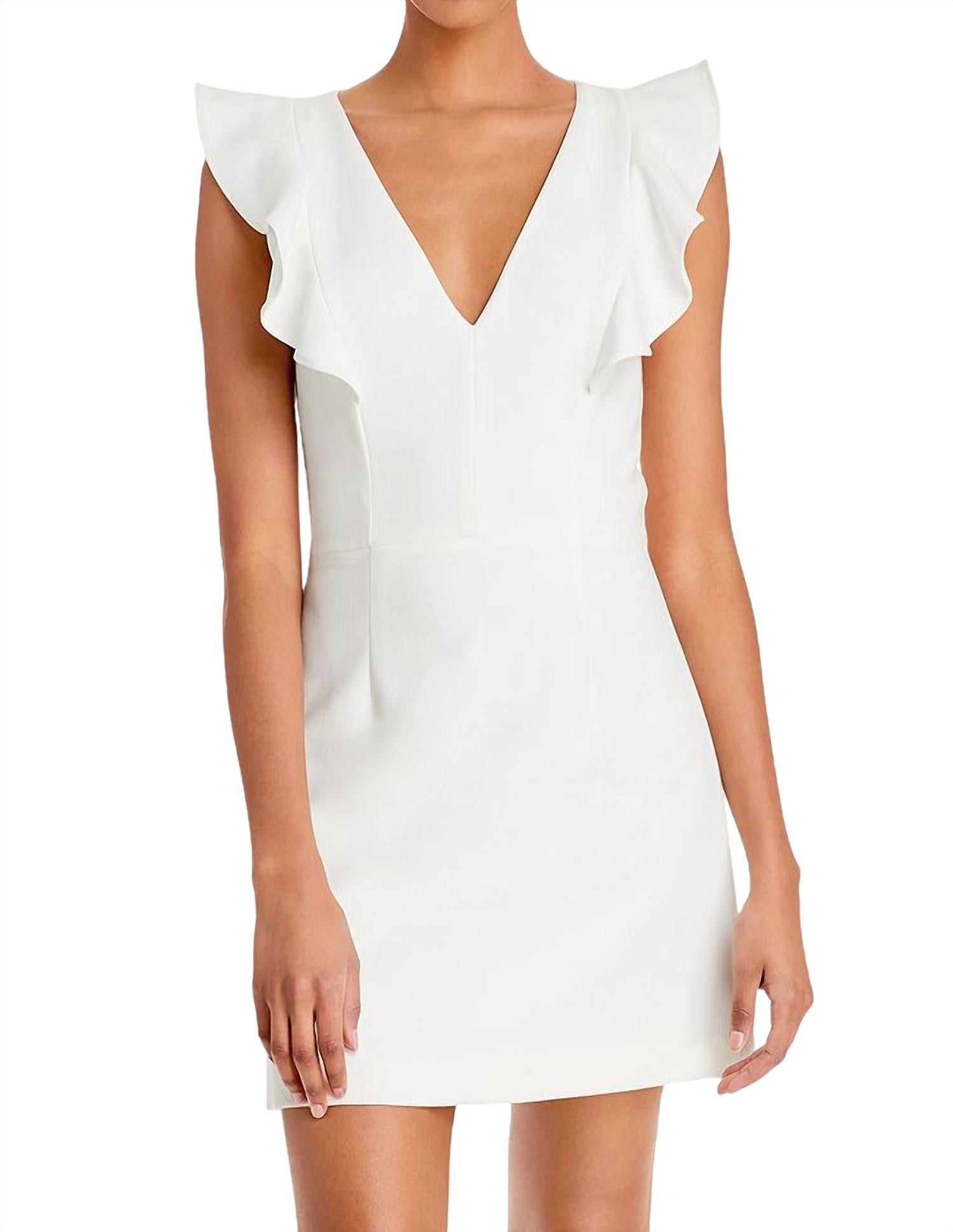 O vestido curto perfeito para os meses mais quentes. Decote em V. Mangas curtas com babados. Corte em A. Costuras modeladoras no mesmo tom. Fecho de zíper oculto nas costas. Importado. Tecido levemente elástico. Poliéster/viscose/elastano; forro parcial: poliéster. Projetado para um comprimento curto. Aproximadamente 84 cm da nuca até a bainha, com base no tamanho 4.