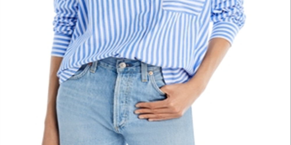 Camisa feminina French Connection com listras grossas e ajuste relaxado, azul, tamanho P