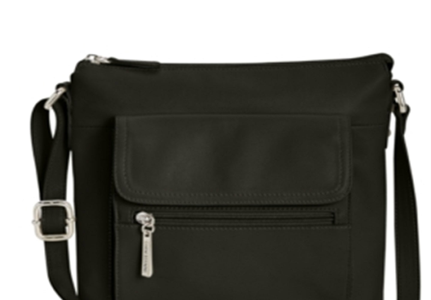 9 L x 9-1/2 A x 2 P; peso; 1,25 lb (a largura é medida na parte inferior da bolsa) | Fecho de zíper superior | Alça ajustável com 23 pontos | Exterior com ferragens prateadas com 2 bolsos com zíper e 1 compartimento frontal com aba magnética com 3 bolsos sem zíper e 1 janela para identidade | Interior com 1 bolso com zíper e 1 bolso sem zíper