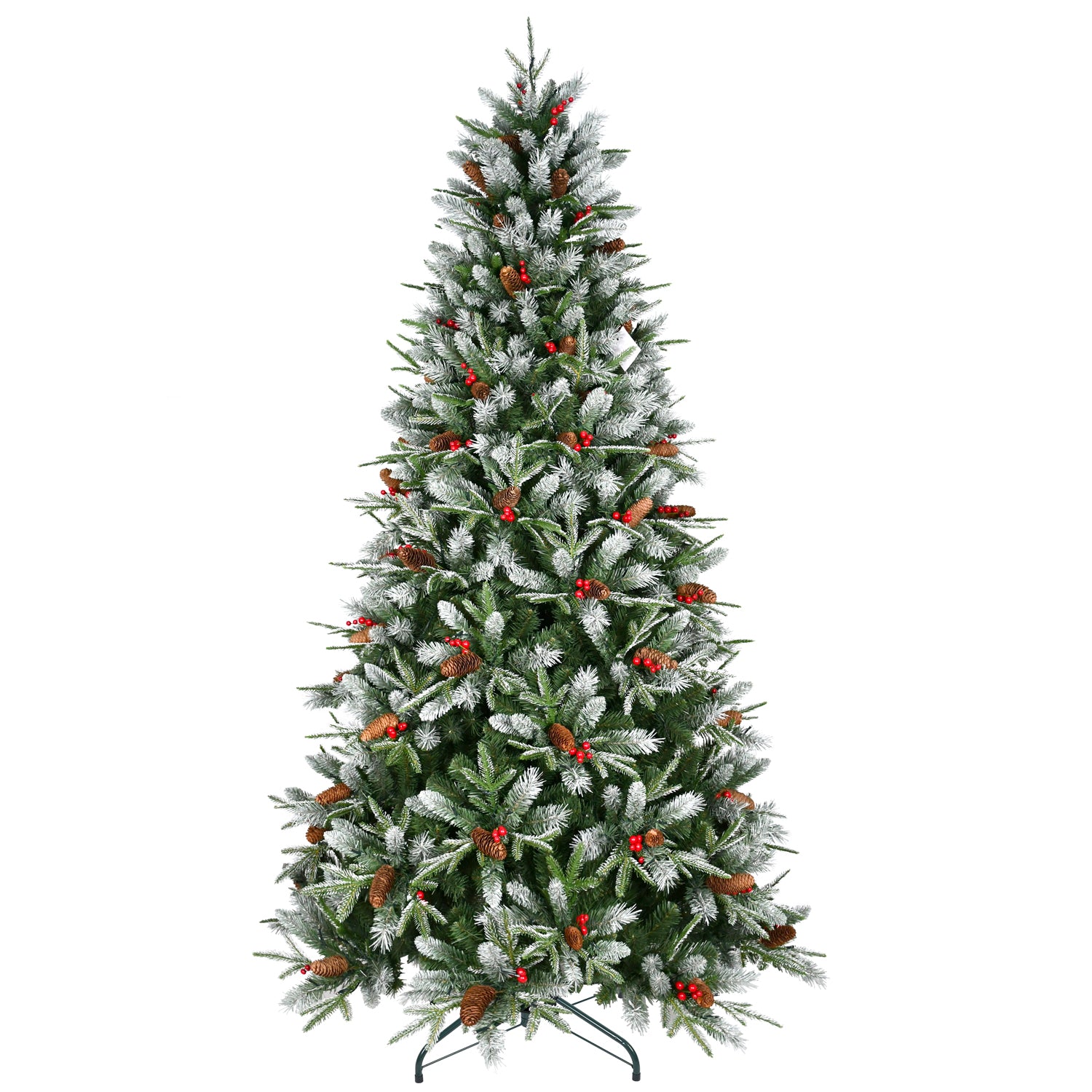 Bring the magic of a snowy forest into your home with this 48-inch artificial Christmas tree. Featuring snow-tipped PE+PVC branches, 35 realistic red berries, and 35 natural-style pine cones, this tree delivers a lush, festive woodland look that adds warmth and elegance to your holiday décor. The hinged branch structure allows for effortless setup, while the sturdy metal stand ensures stability for your ornaments and lights. Perfect for small spaces, apartments, or as a holiday centerpiece.