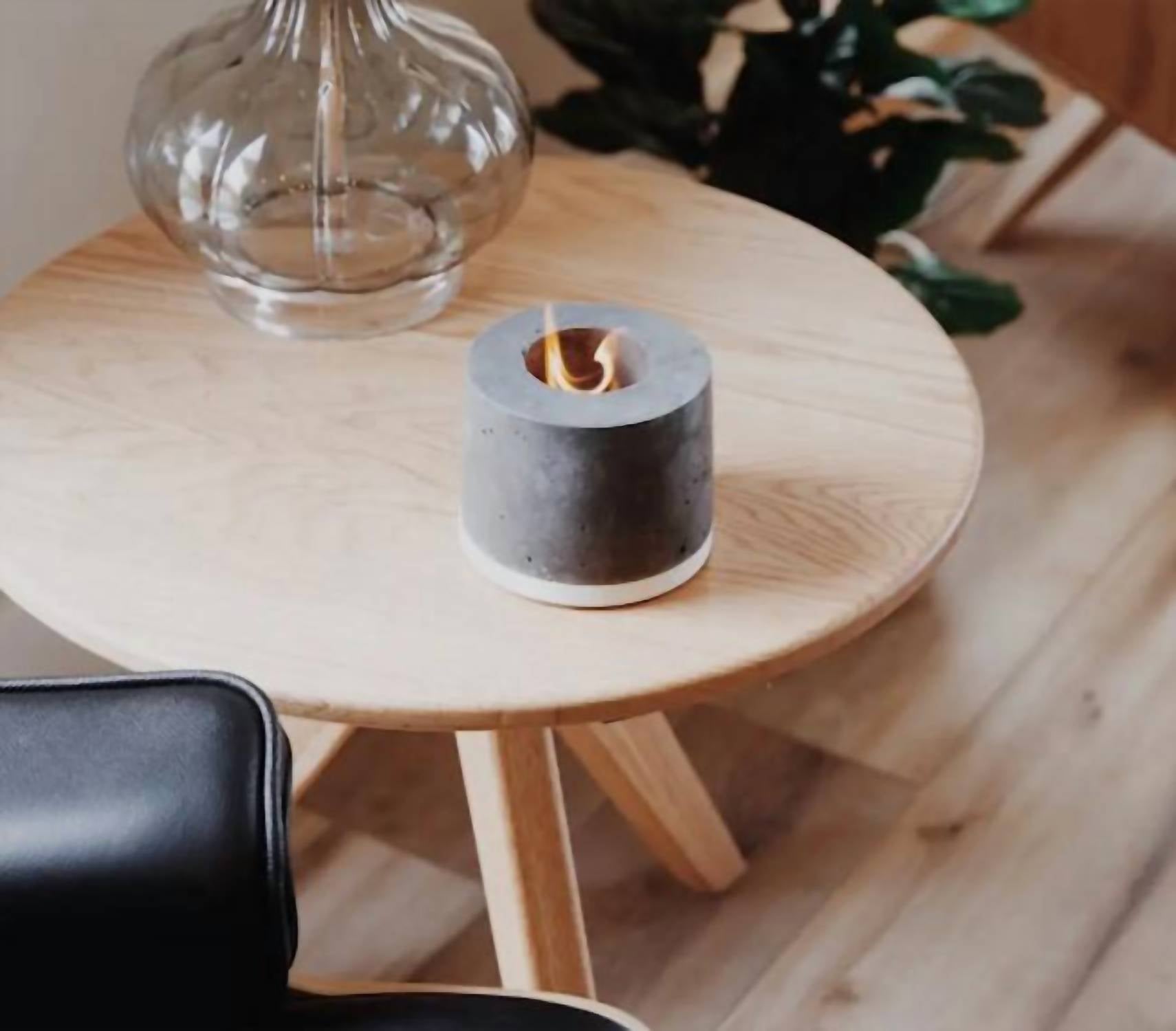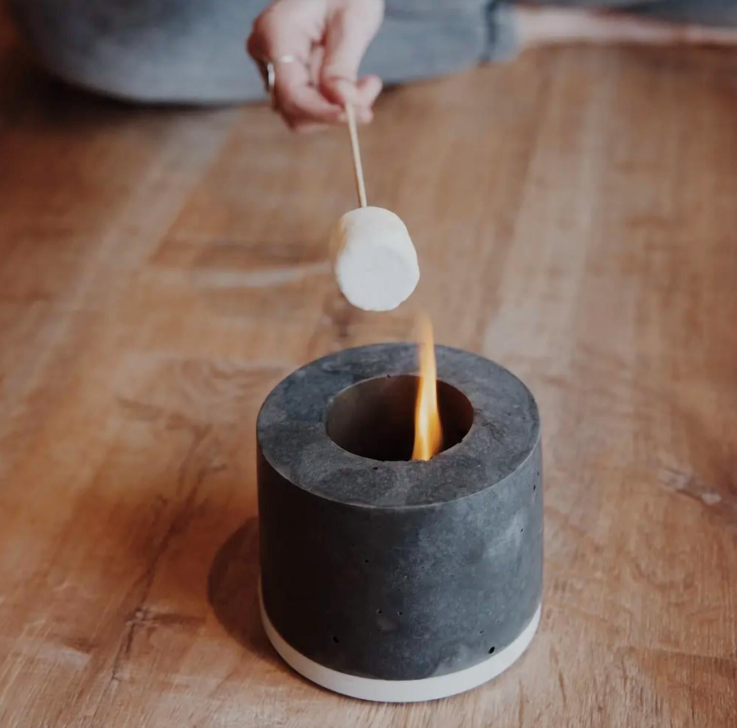 Introducing the Personal Fireplace by FLIKRFIRE, an elegant indoor fireplace perfect for adding ambiance to any space. This portable decor piece in classic black is made from refined cement and rests on a custom quartz-like base. With a size of 5" x 5" x 5", it offers a burn time of 45-60 minutes using just 5oz of 70% or 91% rubbing alcohol for clean burning. Ideal for indoor use, it produces no soot or carbon monoxide in well-ventilated areas.