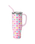 Stay stylishly hydrated with the Women's Be Mine Mega Mug by Swig Life, featuring a charming pastel candy conversational heart design on a glitter pink background. With a generous 30-ounce capacity, this mug is crafted from 304-18/8 stainless steel and incorporates triple-insulated technology to keep your beverage at the perfect temperature. At a height of 8.9 inches and width of 5 inches, it's designed for daily convenience. The mug includes a BPA-free plastic straw with a silicone flexi-tip and is top-rack dishwasher safe for effortless cleaning.