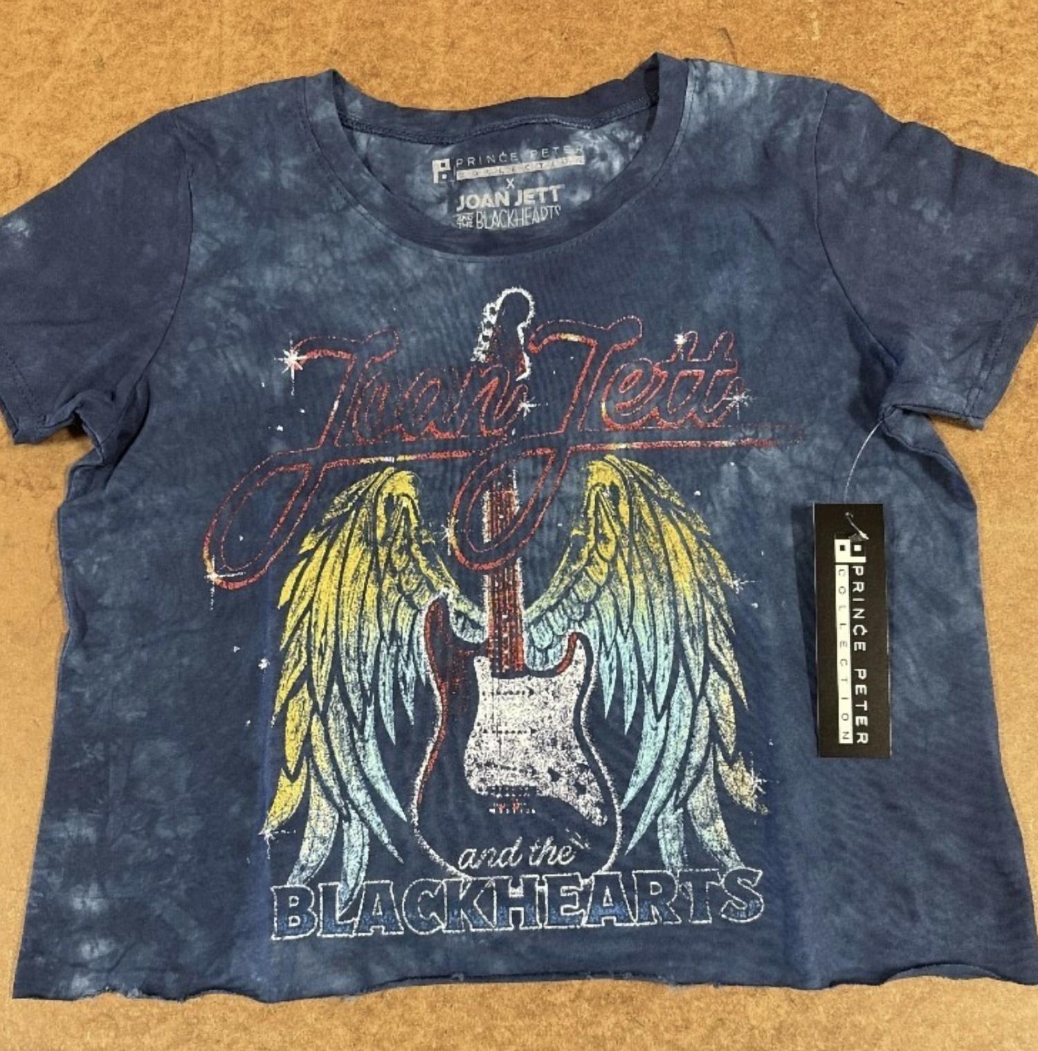 Embrace your rock and roll spirit with the Women's Joan Jet And The Blackhearts Cropped Tee by PRINCE PETER. This short sleeve tee is crafted from 100% cotton and proudly made in the USA. It features a tie-dye blue graphic print with a crewneck design, perfect for a rebellious edge. Closure: Pull on.
