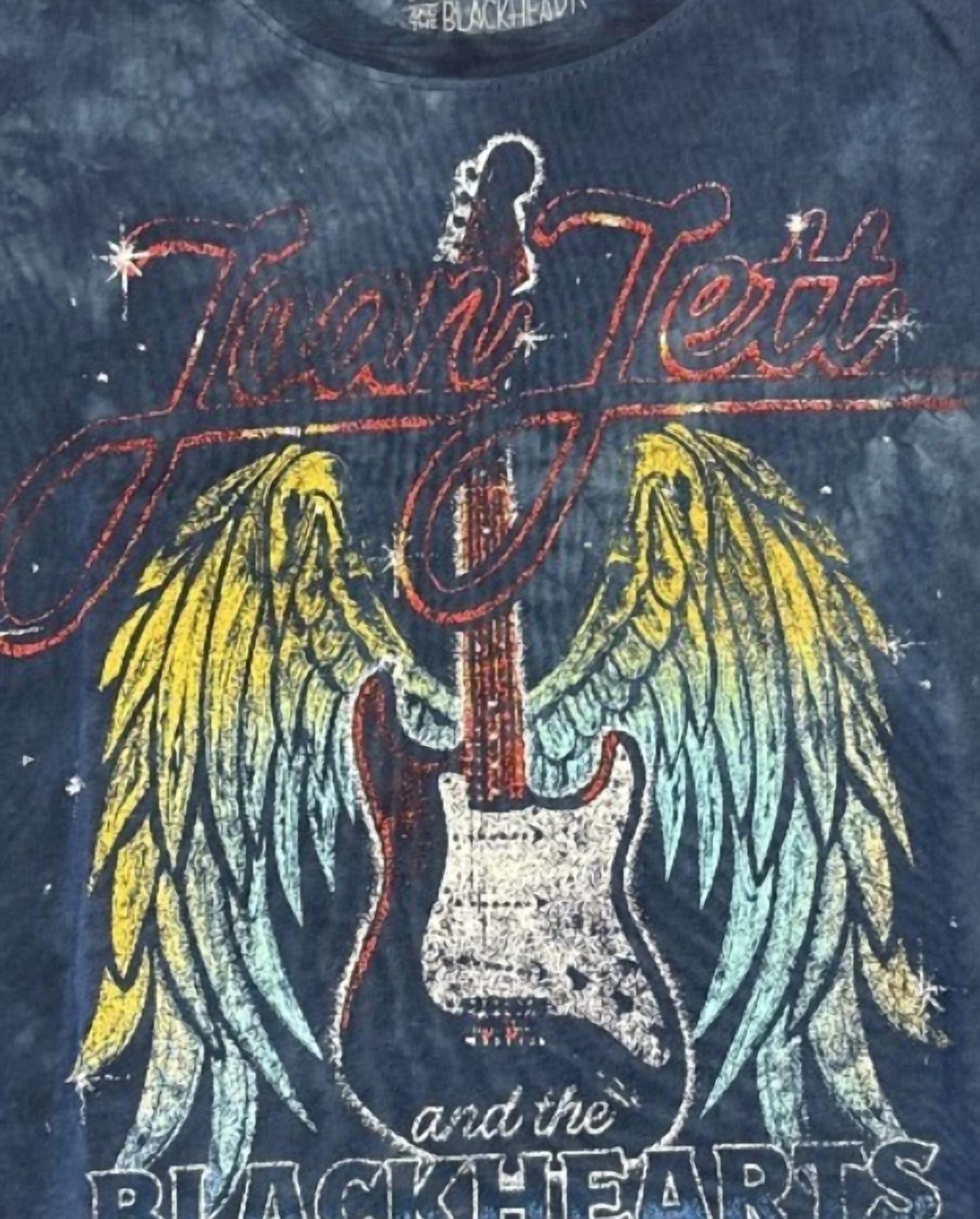 Look no further, you just found your perfect tee! Embrace your rock and roll spirit with the Women's Joan Jet And The Blackhearts Cropped Tee by PRINCE PETER. This short sleeve tee is crafted from 100% cotton and proudly made in the USA. It features a tie-dye blue graphic print with a crewneck design, perfect for a rebellious edge. Closure: Pull on.