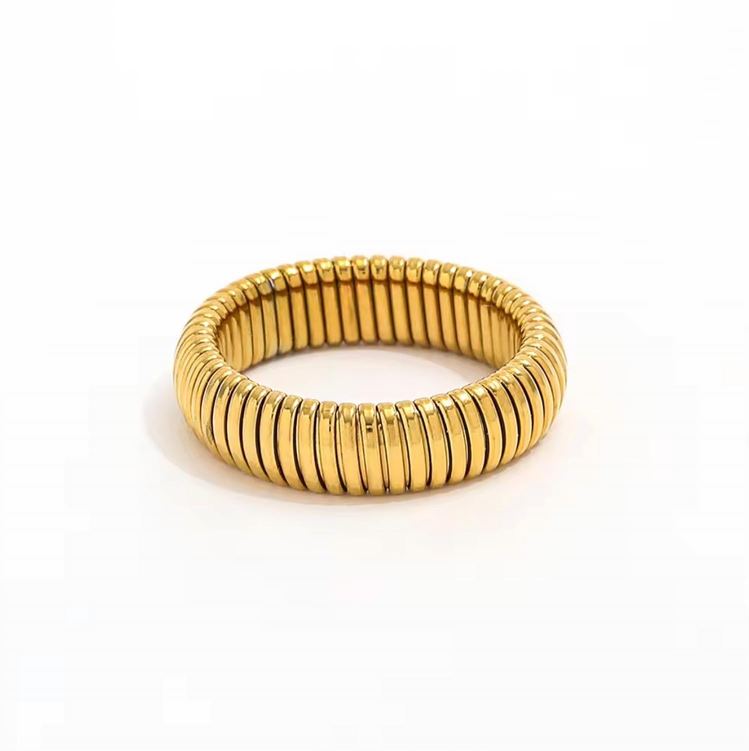 Wear this ring stacked or by itself... you can't go wrong. Elevate your accessory game with the Women's Reign Ring by Alchemy & Co. This fine ring, featuring an 18K gold-plated stainless steel design, offers both hypoallergenic comfort and water resistance, making it perfect for everyday wear. Its stretchy, pull-on style ensures a perfect fit without sacrificing elegance. Enjoy the nickel-free and lead-free craftsmanship in a timeless gold hue.