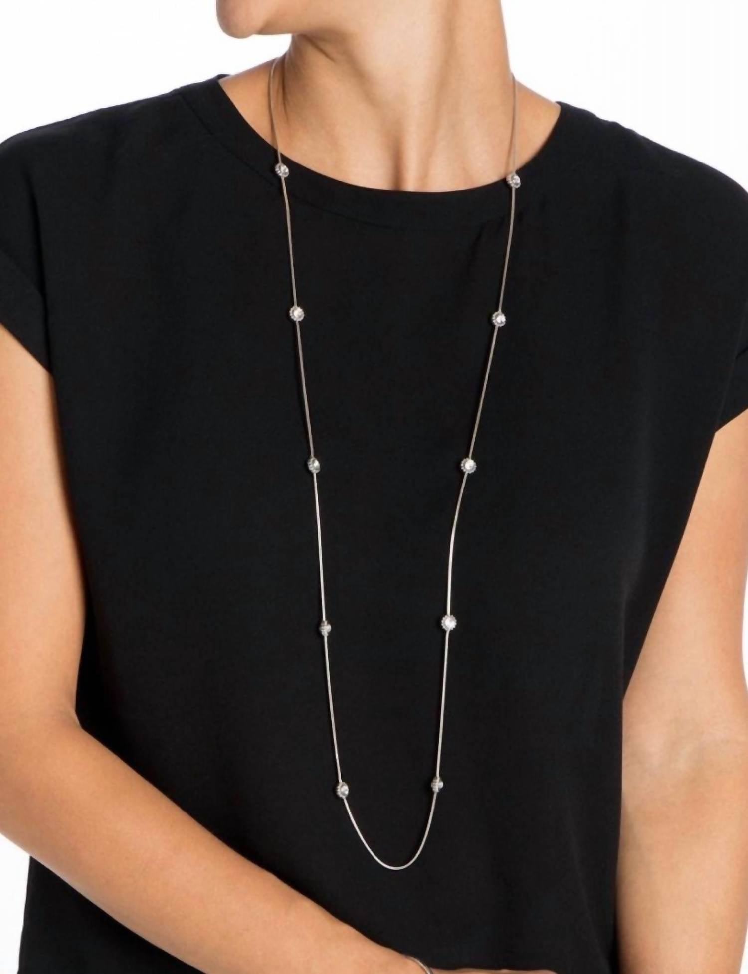 Introducing the Women's Twinkle Long Necklace by Brighton, a stunning piece in elegant silver that makes a perfect statement for any outfit. Crafted from high-quality sterling silver, this fashion necklace adds a touch of luxury to your collection. This necklace is 42 inches to 44 inches long, offering the perfect length for versatile styling. Care instructions are not specified, so please refer to your jeweler for advice.